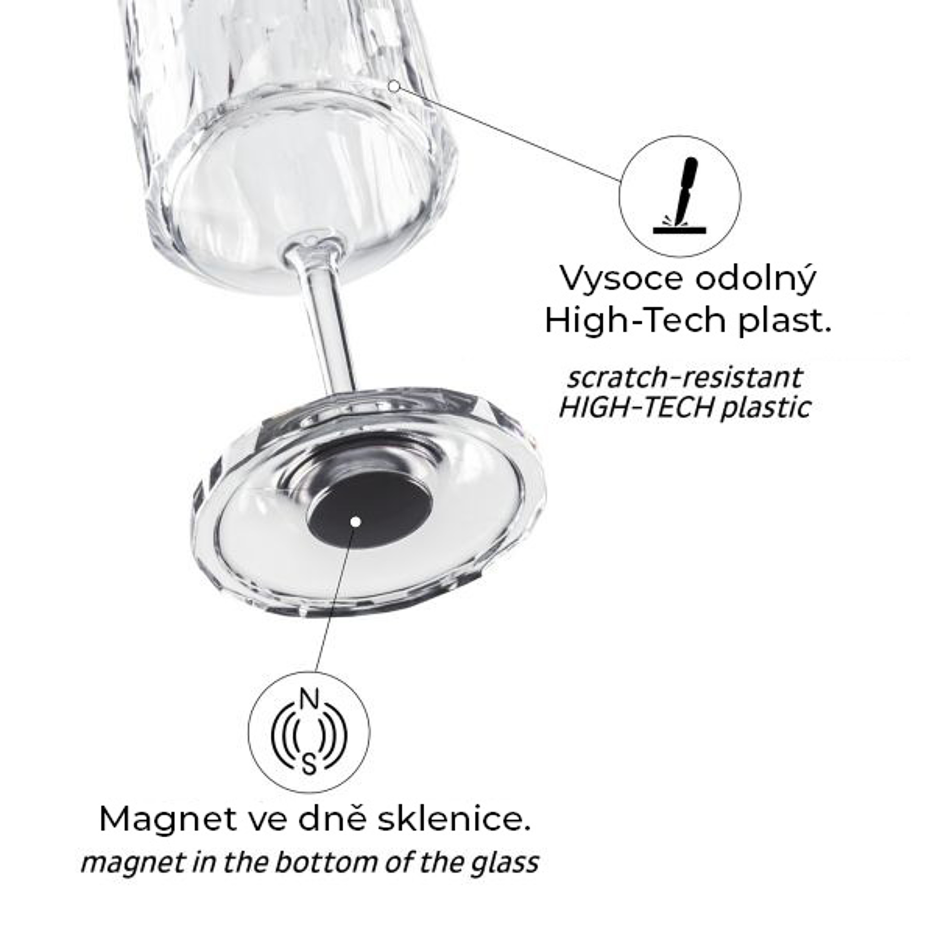Magnetická sklenice SILWY na víno určená pro kempování je pojmem „plastové sklenice“ možná zavádějící, protože se svými běžnými protějšky mají jen pramálo společného. Tyto sklenice jsou vyrobeny z mimořádně kvalitního plastu, který svou dokonalou imitací připomíná sklo. Představte si, že máte v rukou sklenici, která na první pohled i dotek působí jako pravé křišťálové sklo. Když tyto sklenice postavíte na stůl, jejich lesk a průhlednost vás oklamou natolik, že byste přísahali, že jde o pravé sklo.