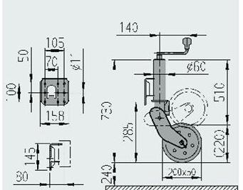 .Automaticky sklopné opěrné kolečko s navařenou přírubou. Po vyklopení a vysunutí se výsuvná část protáčí kolem svislé osy. Při manipulaci a pojíždění s přívěsem lze tak snadno měnit směr jízdy.