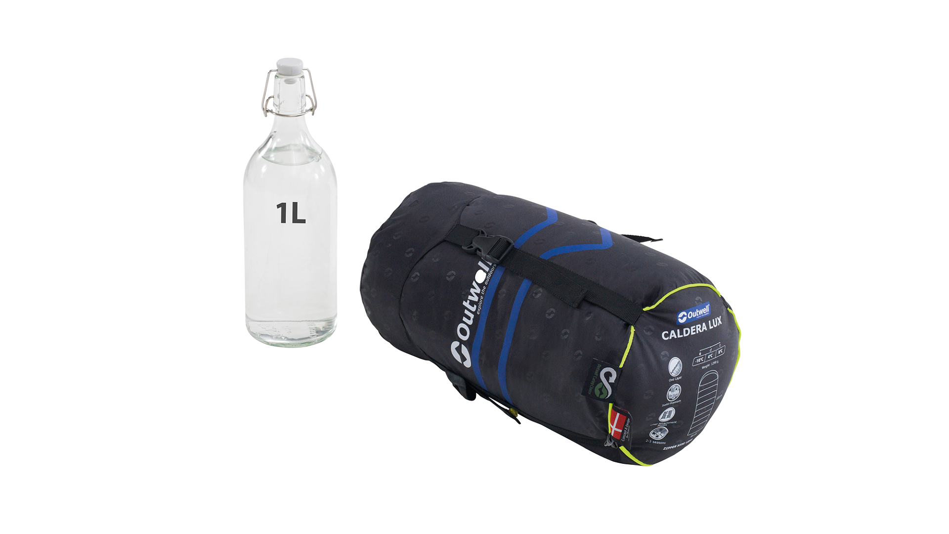Outwell Caldera Lux je všestranný spací pytel, který skvěle kombinuje kompaktnost, nízkou hmotnost a tepelný komfort. S hmotností pouhých 1 290 g a zabalenými rozměry 22 × 18 cm se hodí na cesty, ať už v karavanu, obytném voze nebo letadlem.