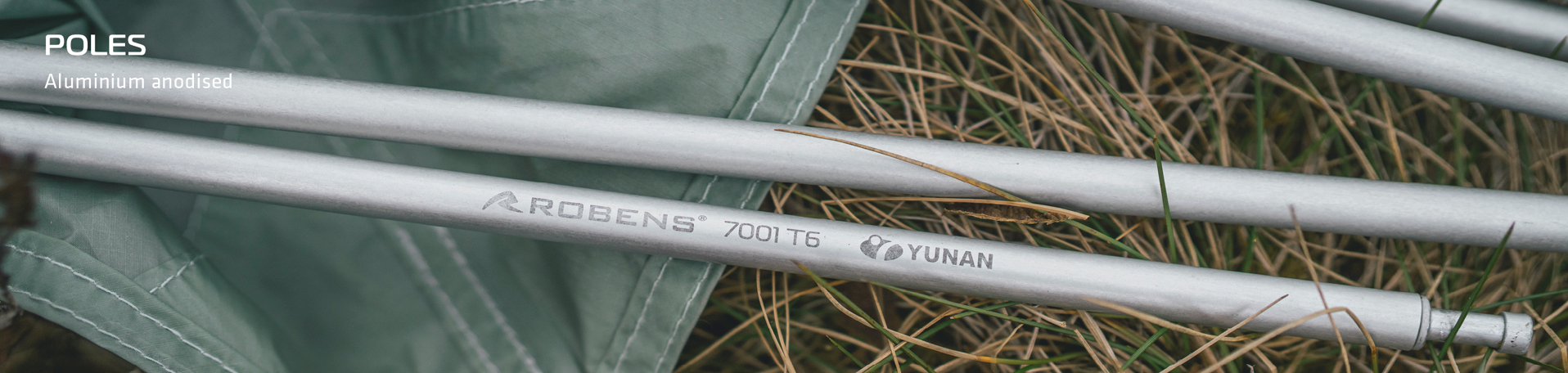 Hliníkové pruty #7001 T6 s průměrem 8,5/7,0 mm jsou eloxované, pevné a lehké. Celý stan odolá větru až do rychlosti 200 km/h, což potvrzují Robens windtesty. Balený má kompaktní velikost 39 × 13 cm.