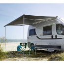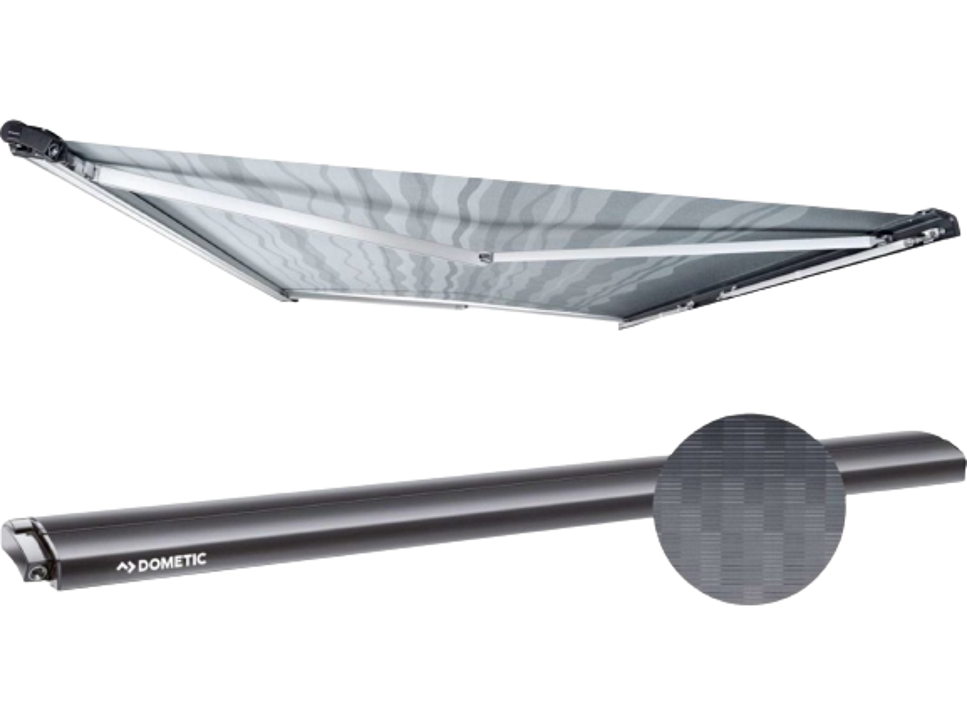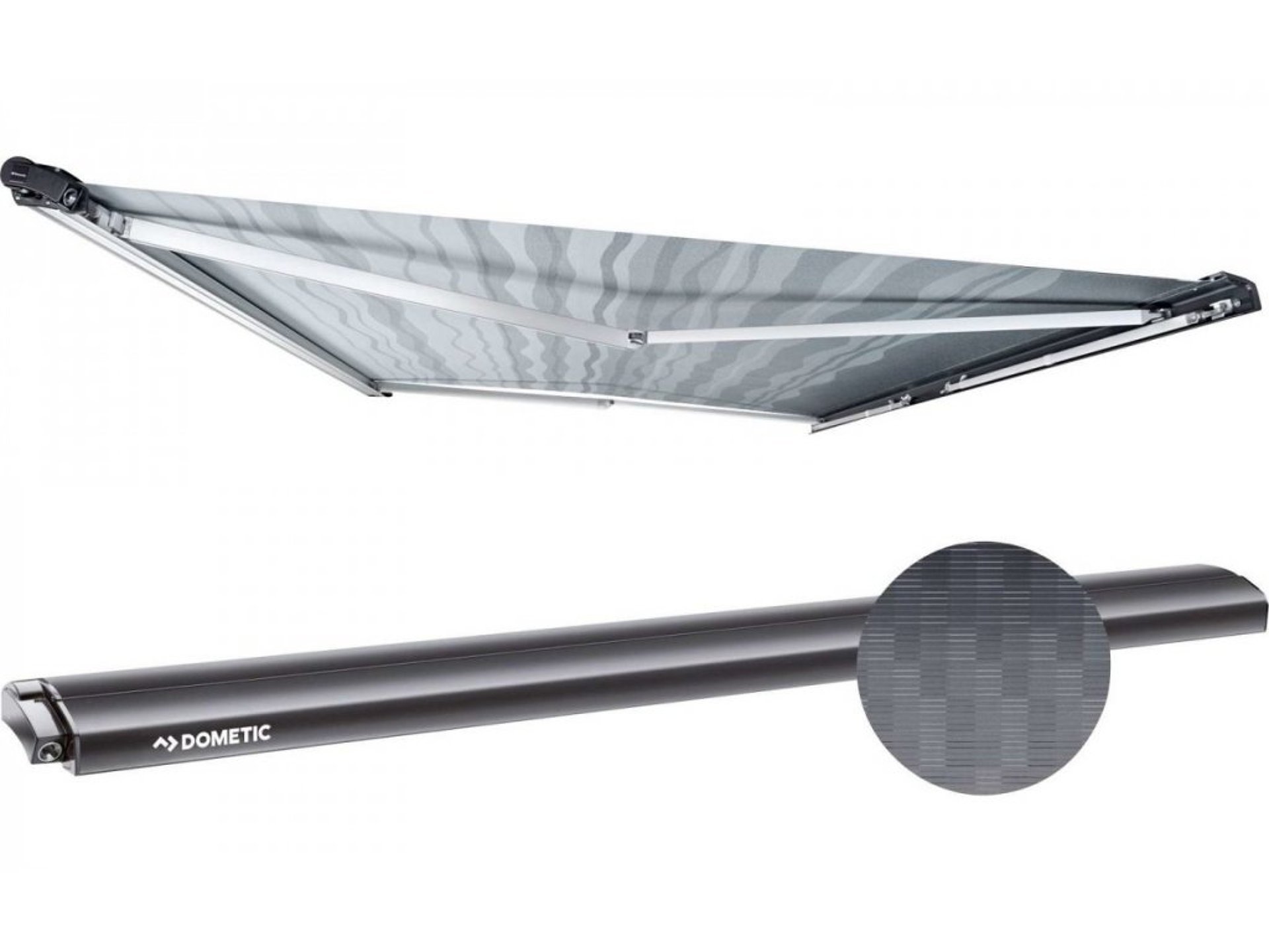 Střešní markýza pro dodávky, menší obytné vozy a karavany. Ovládání manuální. Barva krytu černá, barva tkaniny šedá. Délka 3,5 m.