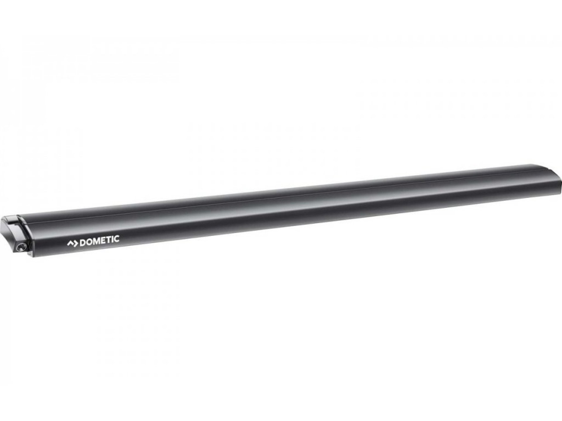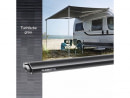 Střešní markýza pro dodávky, menší obytné vozy a karavany. Ovládání manuální. Barva krytu černá, barva tkaniny šedá. Délka 3,75 m.