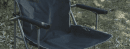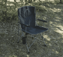 Pohodlné kempingové křeslo s vyšším posedem, držákem na nápoje a polstrovanými područkami.
