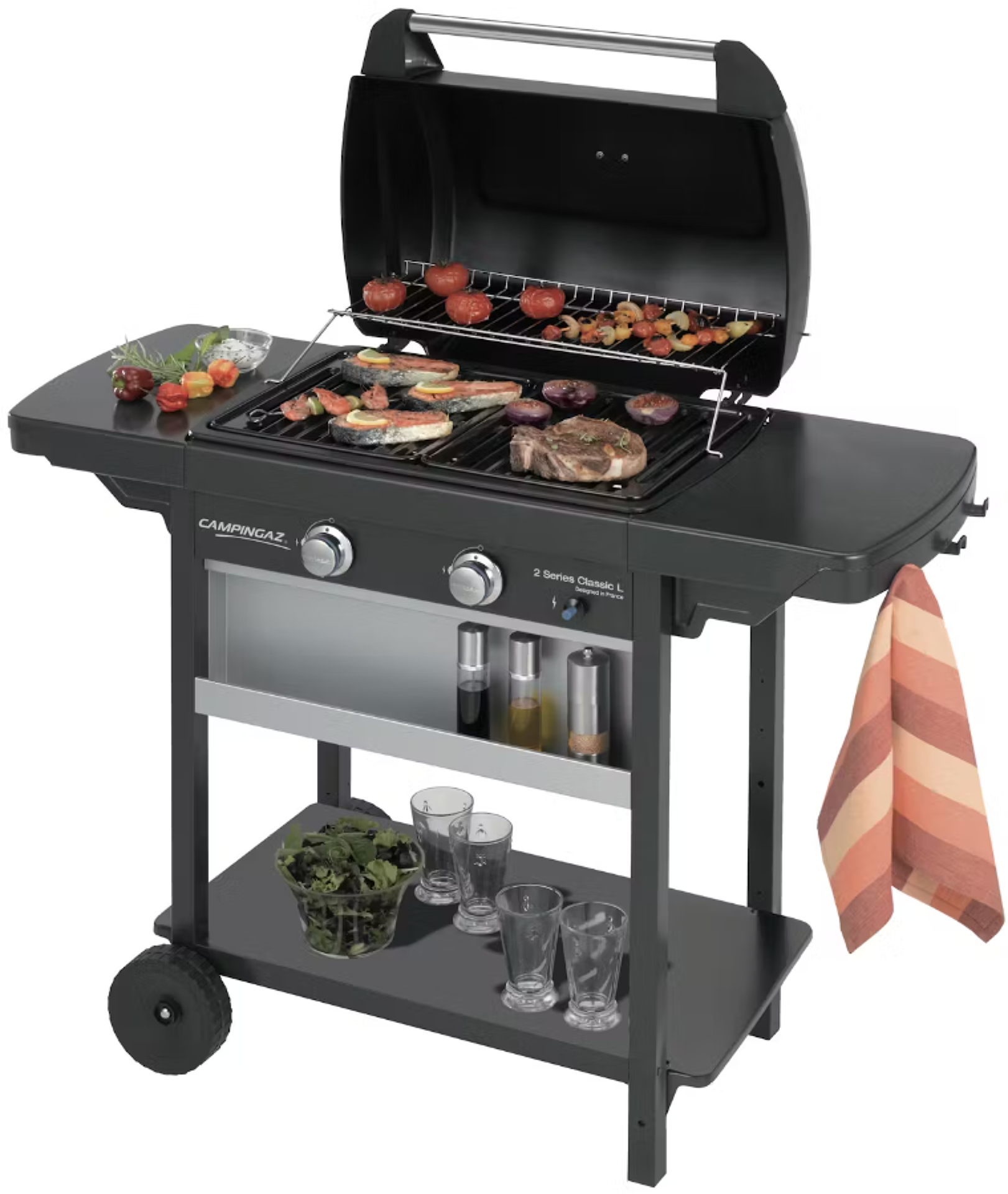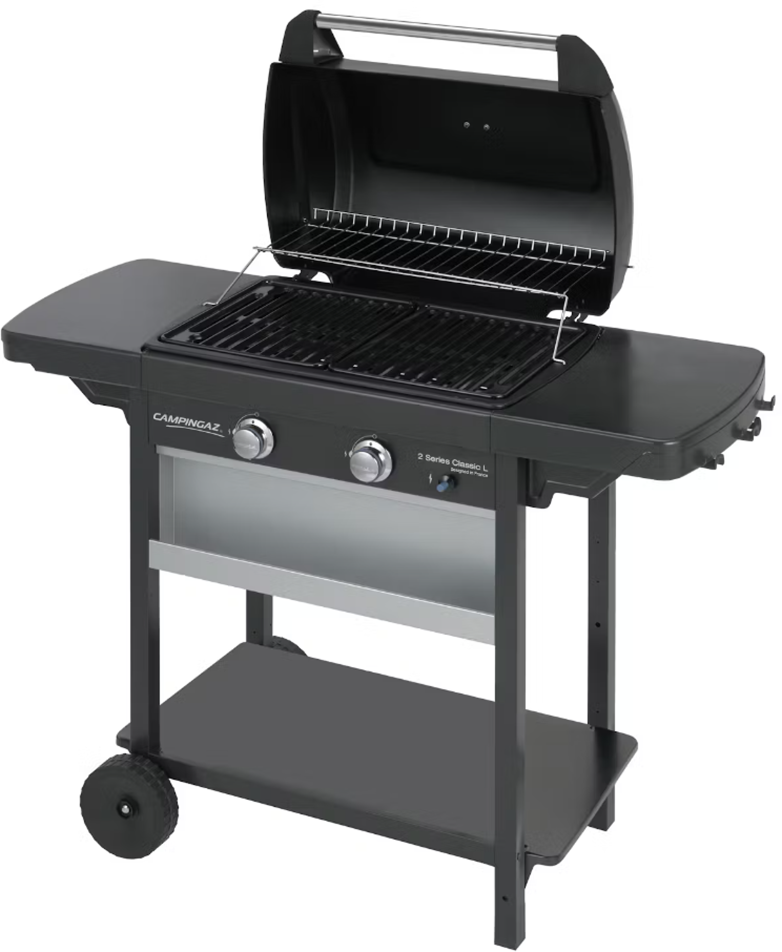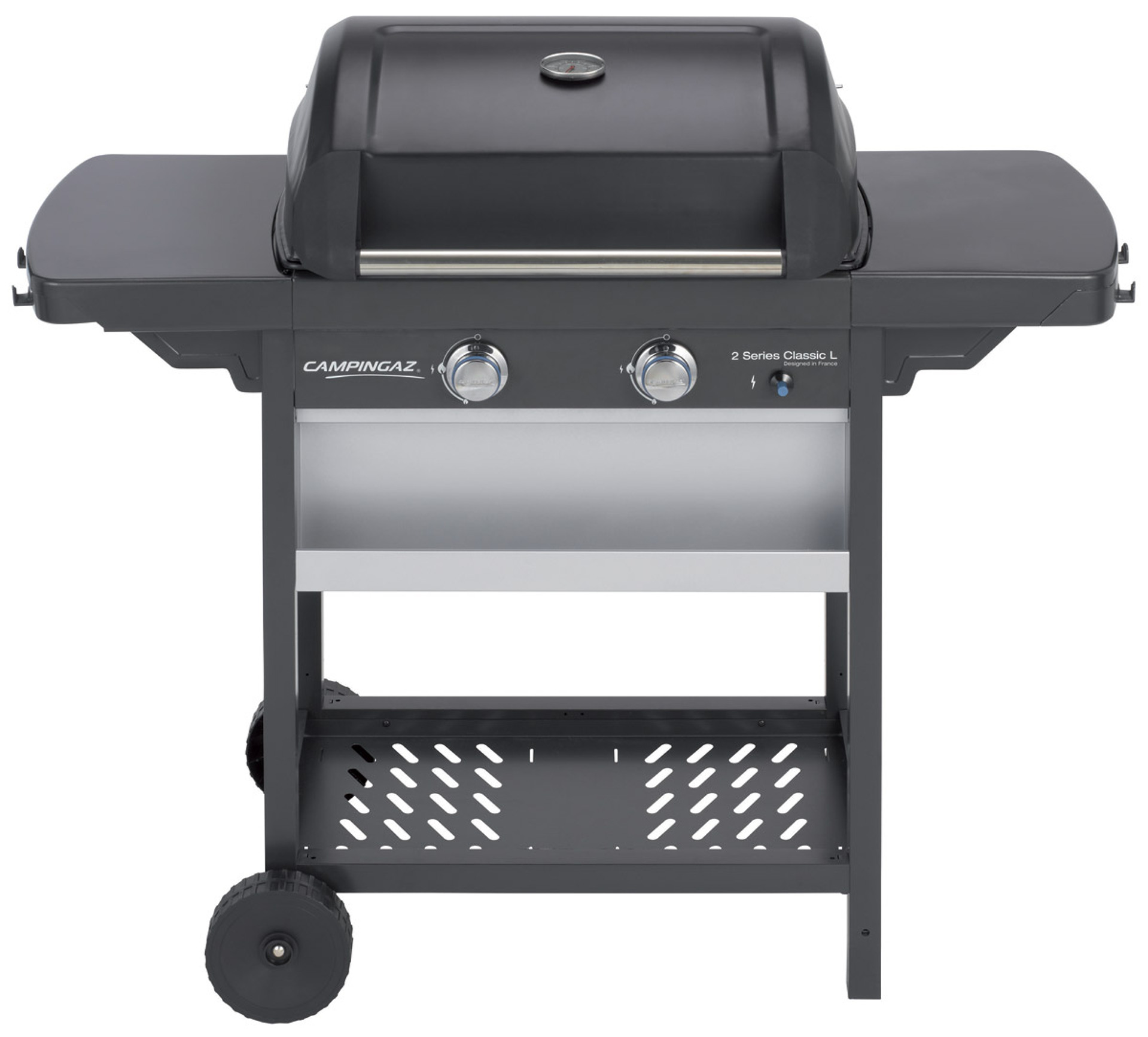 Plynový gril 2 Series Classci L se dvěma plochými hořáky z aluminizované oceli, umožňující nezávislého grilování pouze na polovině nebo na celé ploše grilu.