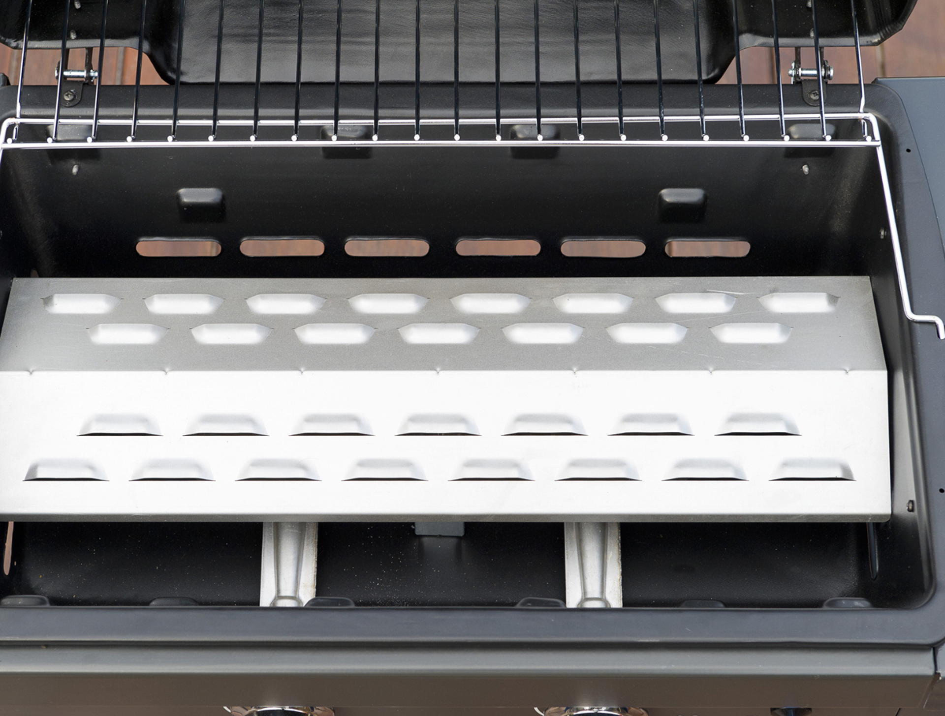 Hořáky jsou chráněny krycí stříškou, která slouží i jako rozptylovač tepla pro dosažení rovnoměrné teploty na celé ploše. S grilovací plochou 2100 cm2 a výkonem 7.5 kW obsloužíte najedou až 10 osob