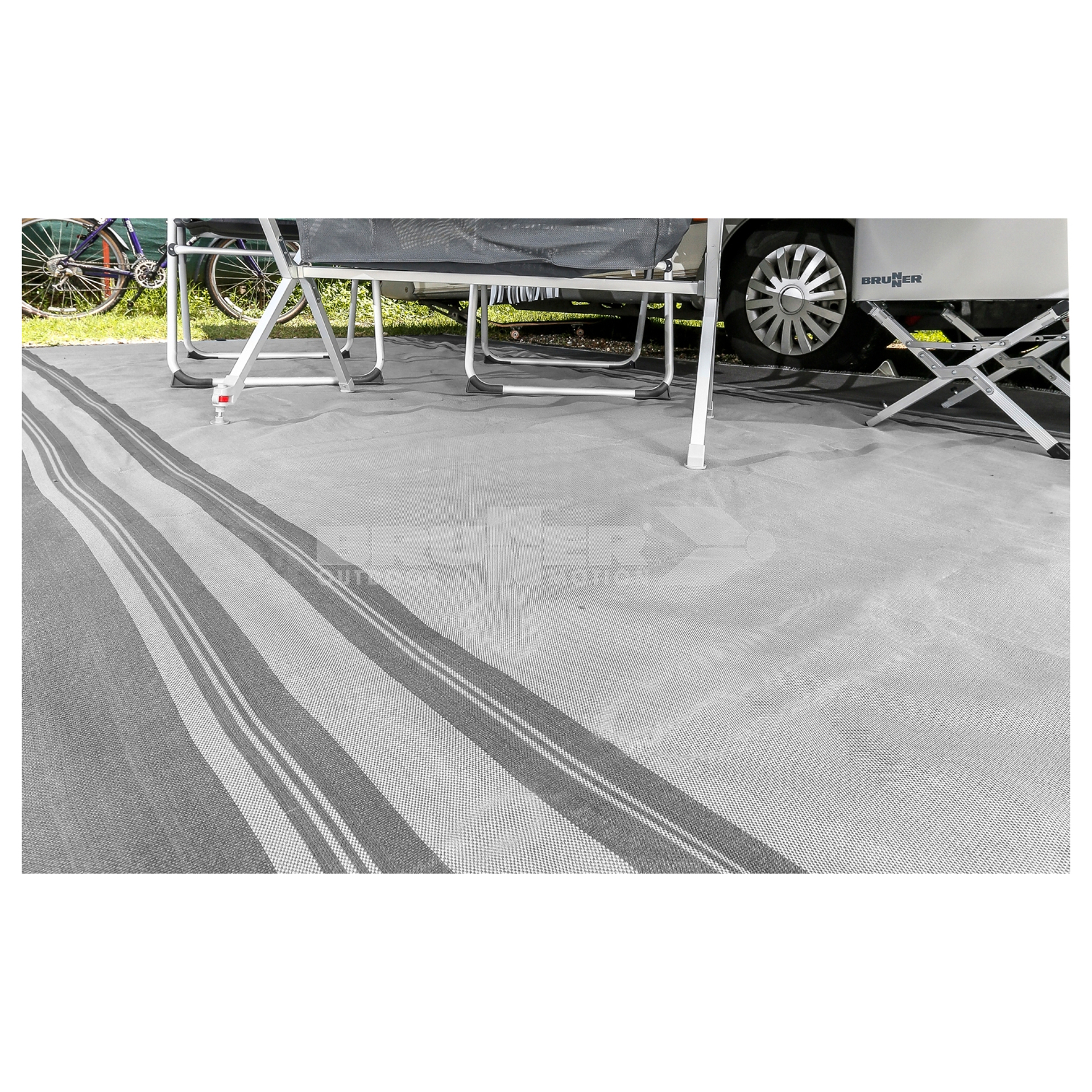 Odolný koberec Brunner Trip pro stany a markýzy vyrobený ze 100% polypropylenového vlákna. Ideální pro markýzy karavanů, ale i pro další venkovní použití (terasa, balkon atd.). Prodyšný, snadno omyvatelný a odolný proti vlhkosti. K dispozici v různých rozměrech. S taškou.