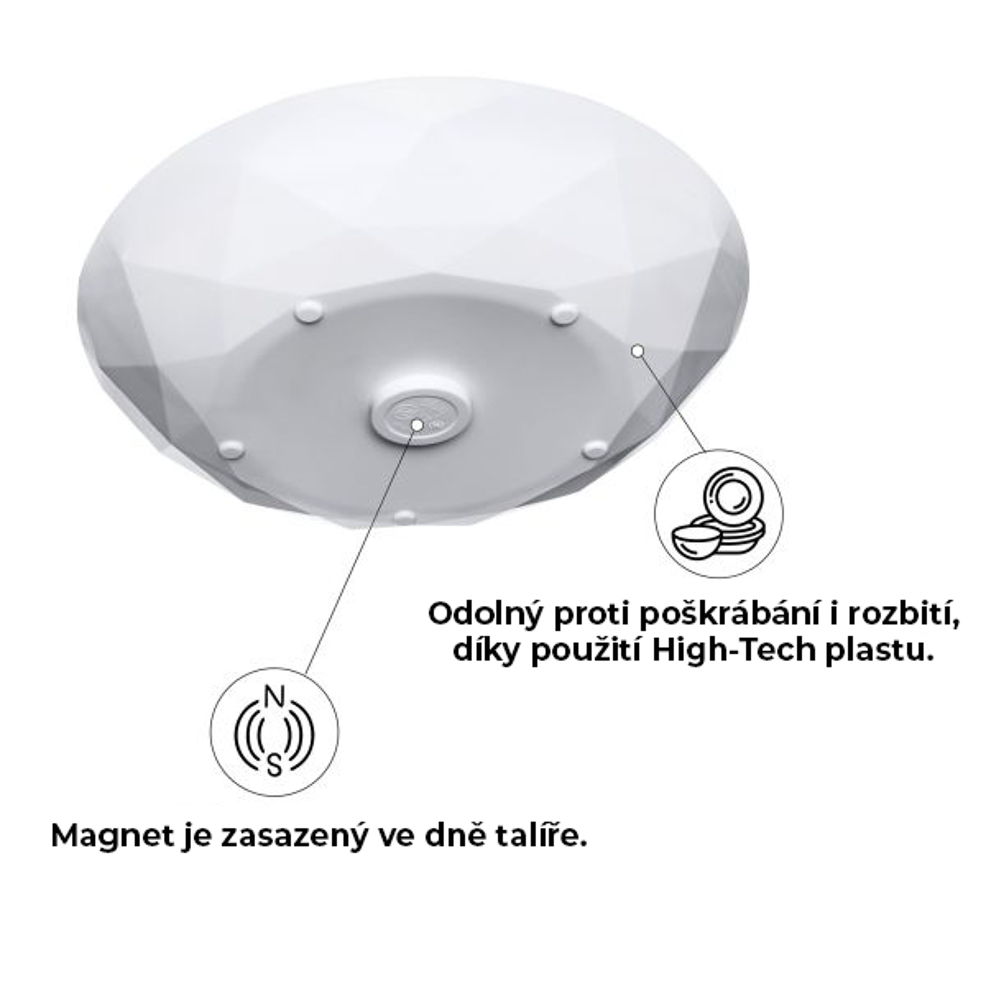 Talíř je nejen praktický, ale také esteticky propracovaný. Elegantní bílý design v kombinaci s moderní technologií magnetického uchycení vytváří stylový doplněk pro každou příležitost.