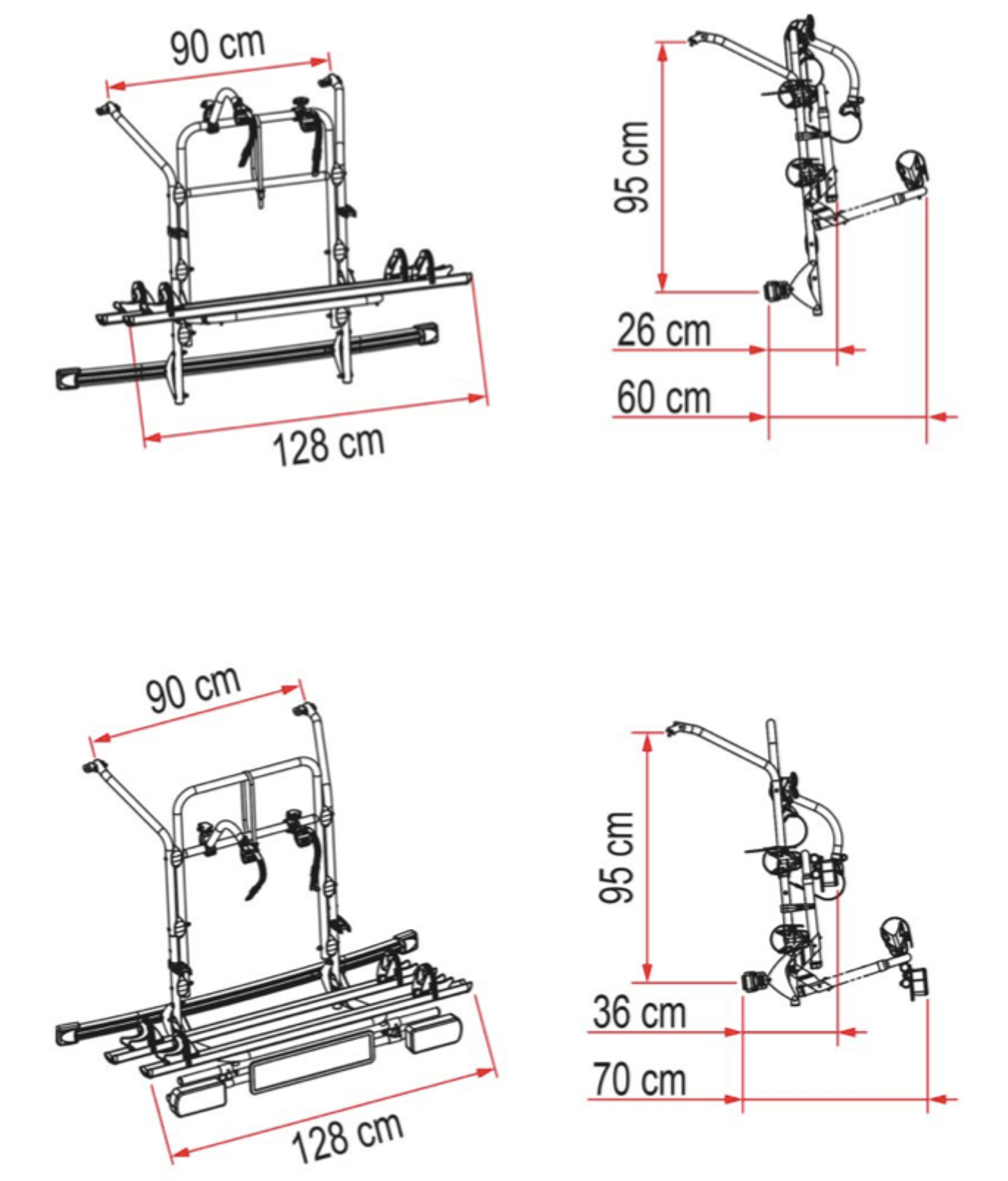 Rám pro uložení kol je možné instalovat do dvou různých výšek, v případě instalace v nižší pozici je potřeba použít přídavný držák SPZ se světly, který není součástí balení a je nutné jej dokoupit..
