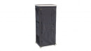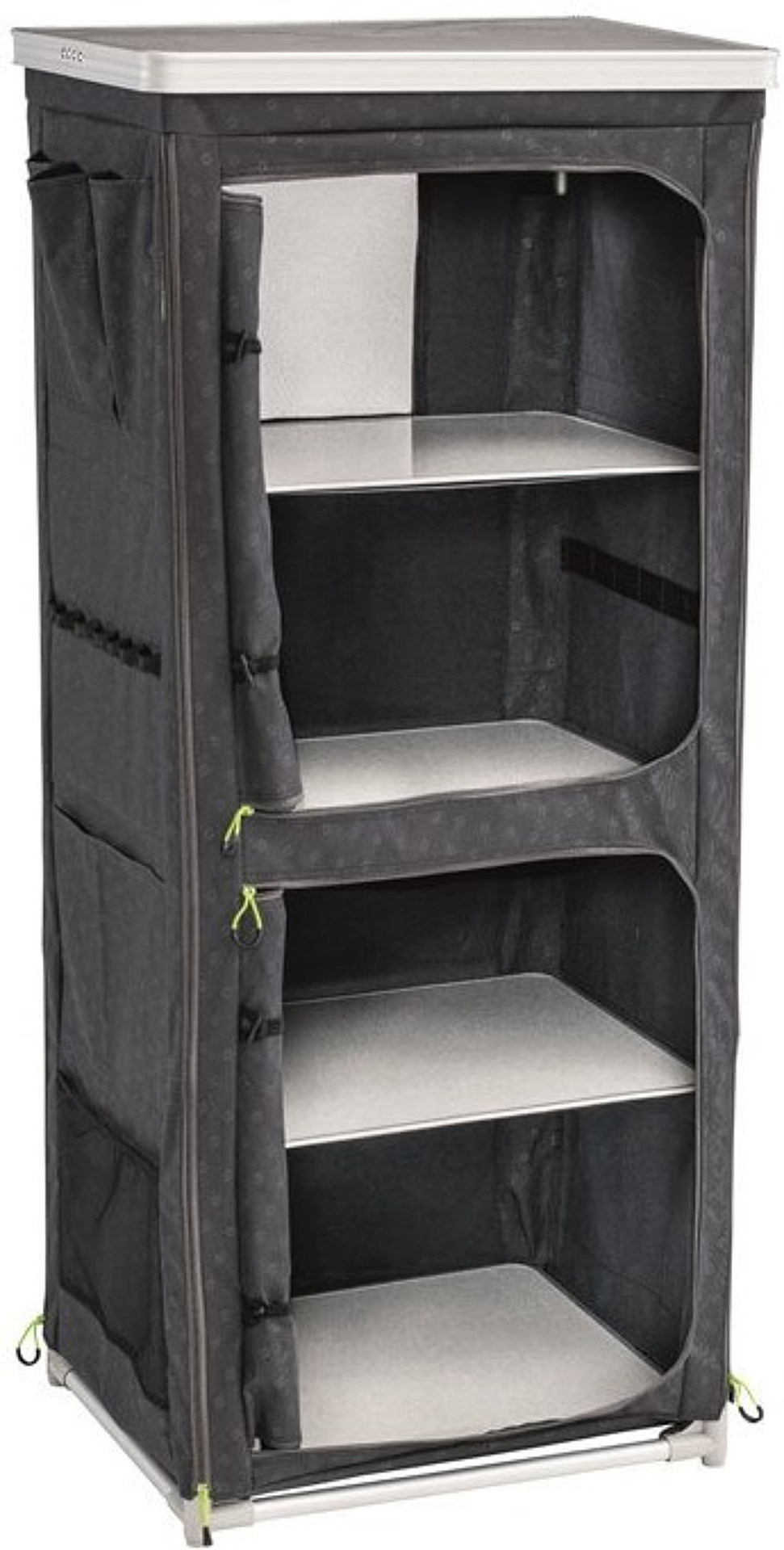 se čtyřmi policemi, dvířky na zip a ventilační síťkou. Otevírání a skládání skříňky je hotové během několika sekund. Systém vnitřního rámu nabízí velký poměr vnitřního objemu. Sklopná dvířka pro trvalý přístup. Tři horní kapsy na každé straně skříně na drobnosti, jako jsou klíče a mobilní telefon.