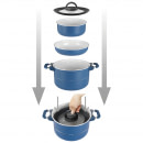 Celá sada je navržena tak, aby šetřila místo – hrnce a pánve lze snadno naskládat do sebe a zmenšit tak jejich objem při skladování. Celková hmotnost je pouze 3,92 kg, což oceníte při častém přenášení.