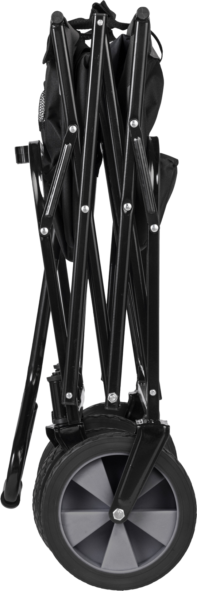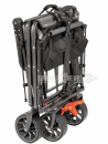 Konstrukci tvoří pevný ocelový rám s práškovým lakováním, který zaručuje vysokou odolnost a dlouhou životnost. Látková korba z vodoodpudivého polyesteru (100 %) je snadno omyvatelná, odolná proti protržení a doplněná reflexním pruhem pro lepší viditelnost za šera. Vozík má velký ložný objem, a přesto je možné jej díky jednorozměrnému skládacímu systému složit během několika sekund do kompaktní velikosti 80 × 55 × 29 cm, což usnadňuje přepravu i skladování.