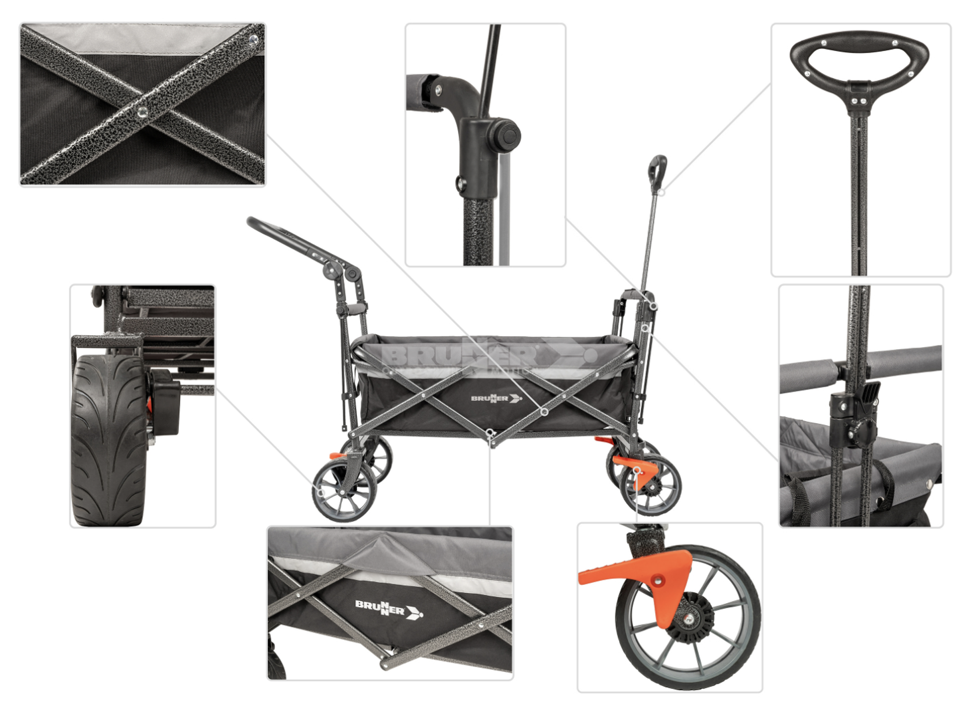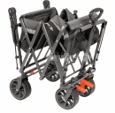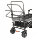 Jeho široká kola zajišťují výbornou stabilitu a rovnoměrné rozložení hmotnosti, takže vozík hladce pojede i po měkkém písku nebo trávníku, aniž by se zabořil. Všechna kola jsou vybavena brzdovým systémem pro bezpečné zastavení na svahu nebo při nakládání. Praktickým detailem jsou dva integrované držáky na nápoje a snadno odnímatelná kola, která usnadňují údržbu nebo převoz.
