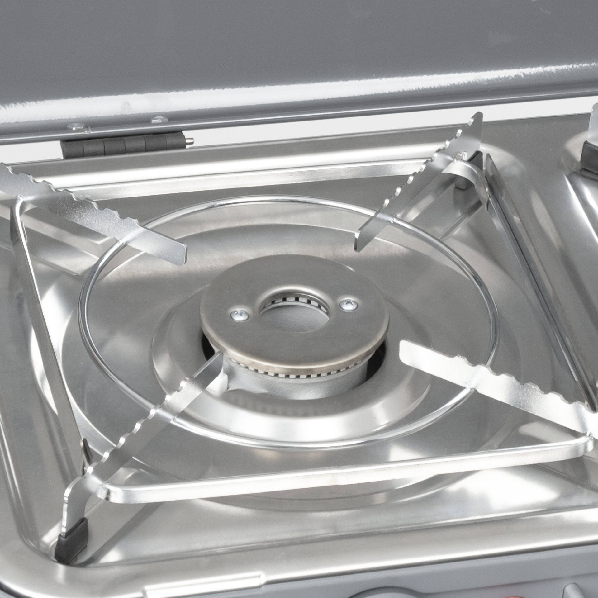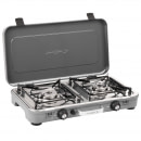 Kompaktní 2plotýnkový plynový vařič z nerezu s piezo zapalováním, víkem a madlem ideální pro kempování i jako záložní vařič doma.
