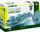 Brunner Dolomit Blue Lunch Box je kompletní jídelní sada pro 4 osoby, která spojuje elegantní vzhled s maximální praktičností. Obsahuje vše, co potřebujete pro stolování na cestách, v karavanu, obytném voze nebo při kempování: