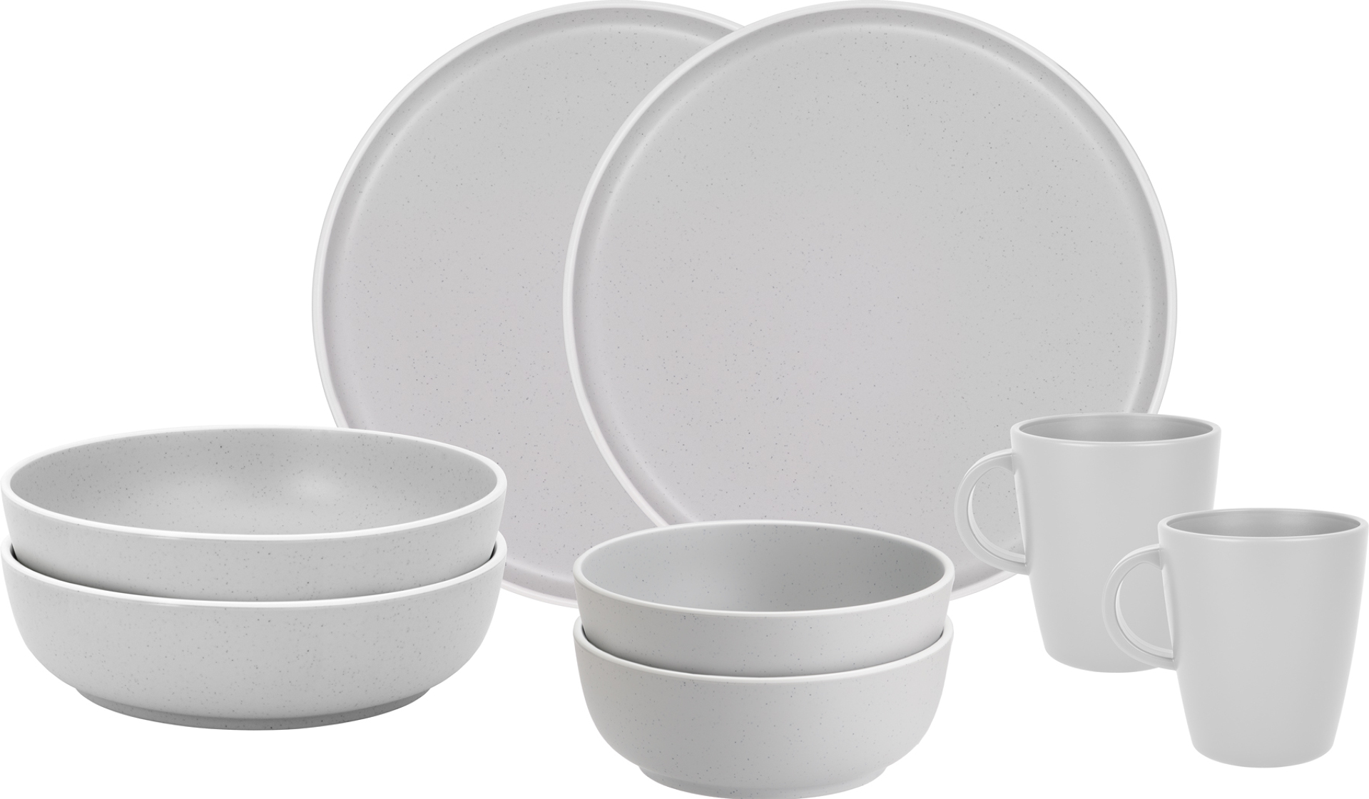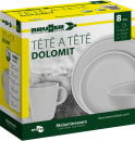 Stylová 8dílná sada nádobí Brunner Dolomit White Tete-A-Tete z melaminu se vzhledem porcelánu, protiskluzovým dnem a vysokou odolností ideální pro kempování i domácnost.
