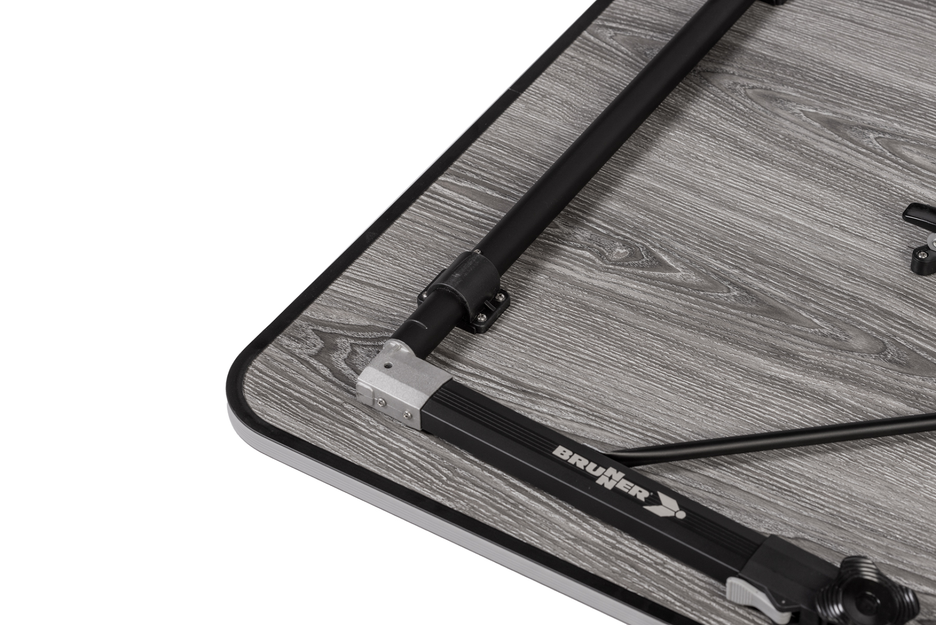 Brunner Elu NG 100 je špičkový kempingový stůl určený pro náročné cestovatele, kteří hledají kombinaci stability, nízké hmotnosti a praktičnosti. Je vybaven nově vyvinutým skládacím mechanismem, který umožňuje extrémně rychlé rozložení i složení bez nutnosti jakéhokoli nářadí. Tento patentovaný systém využívá centrální pojezdovou lištu, díky které stůl postavíte během několika vteřin.