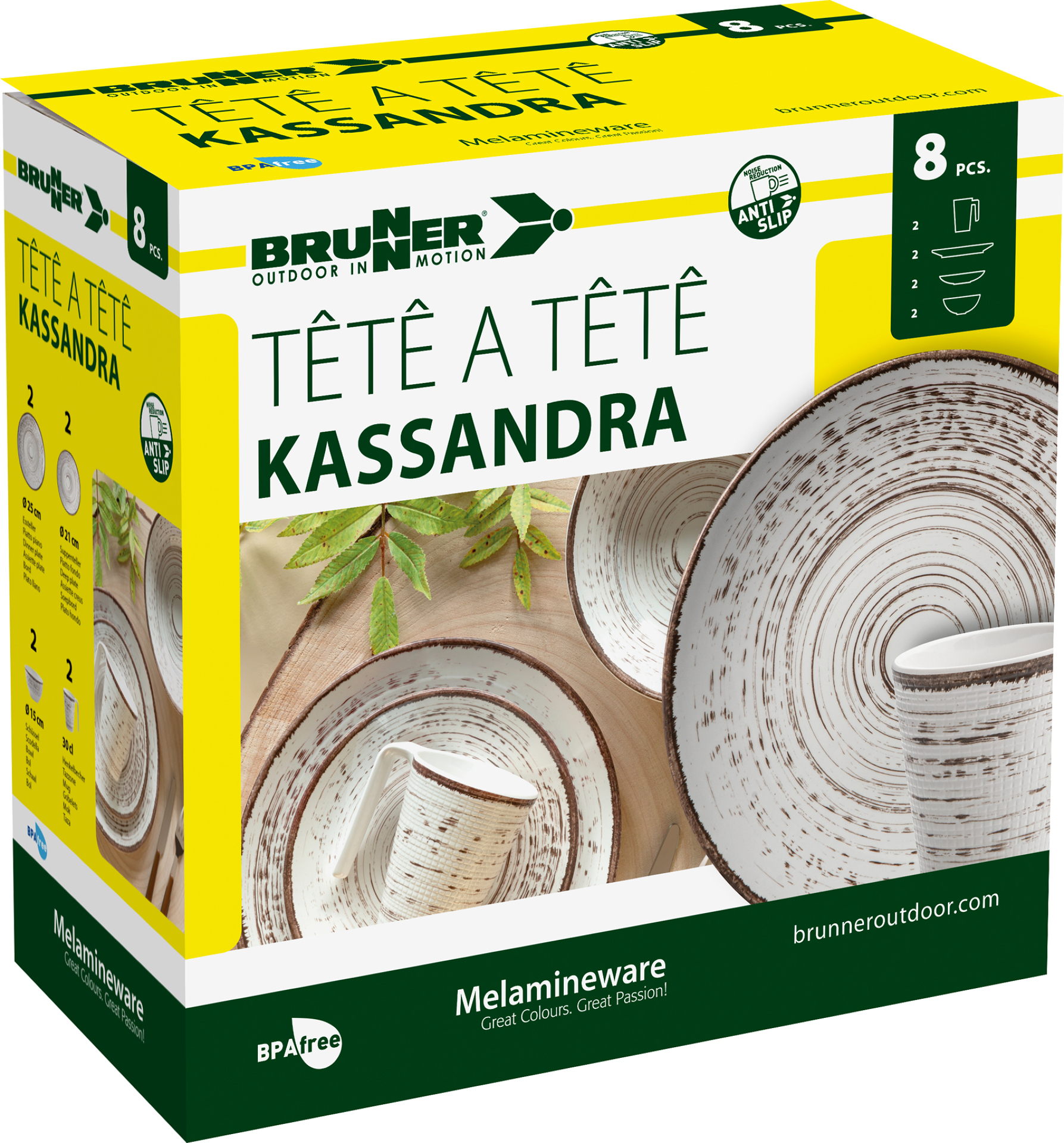 Brunner Kassandra Tête-à-Tête je elegantní a kompaktní jídelní sada pro 2 osoby, ideální pro karavaning, kempování nebo romantické pikniky. Spojuje atraktivní vzhled s odolností a praktičností – ať už jste na cestách nebo si jen užíváte večeři pod širým nebem.