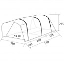 Celkové rozměry stanu jsou 540 x 380 x 215 cm. Váží 24,8 kg a je dodáván v přepravní tašce o rozměru 80 x 35 cm.