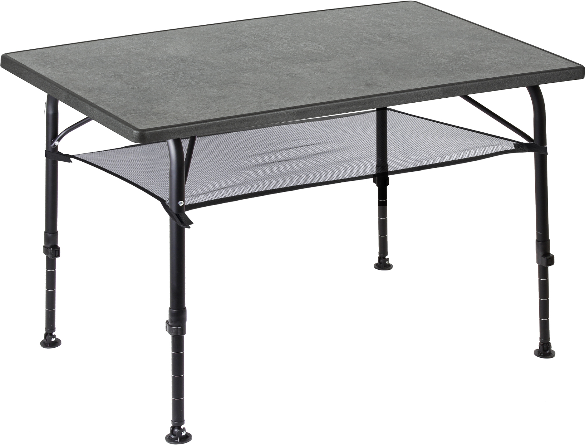 Stabilní kempingový stůl s deskou Sevelit odolnou vůči teplu, poškrábání i UV záření a výškově nastavitelnými nohami elegantní, pevný a ideální pro venkovní použití.