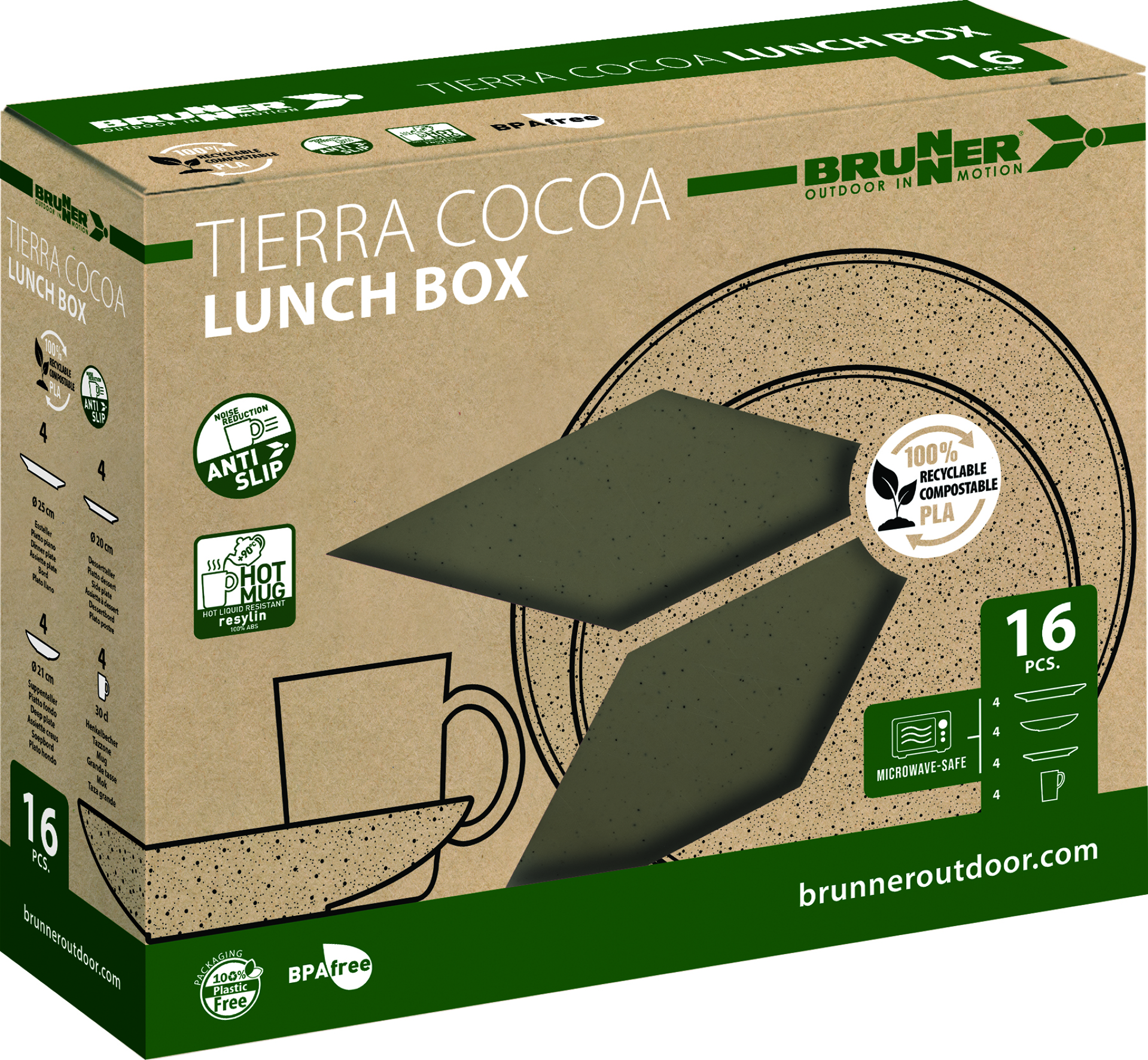 Brunner Tierra Lunch Box Cocoa je praktická 16dílná sada jídelního nádobí určená pro 4 osoby, která spojuje moderní design, odolnost a funkčnost. Perfektní pro kempování, karavaning, pikniky i domácí použití, představuje skvělou rovnováhu mezi estetikou a praktičností.