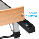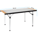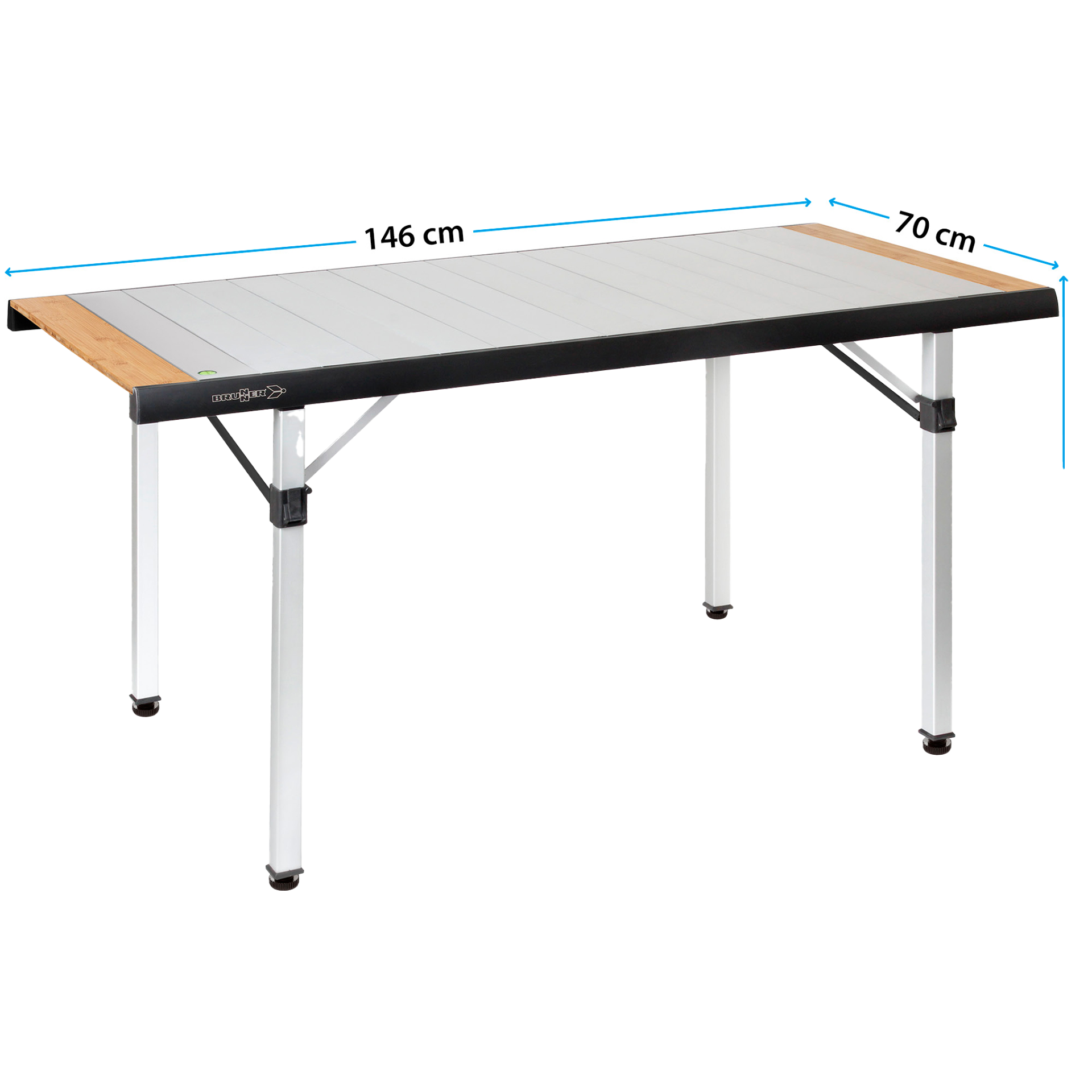 Skládací stůl s hliníkovou rolovací deskou, bambusovými prvky a nastavitelnými nožičkami pro stabilitu na nerovném terénu.