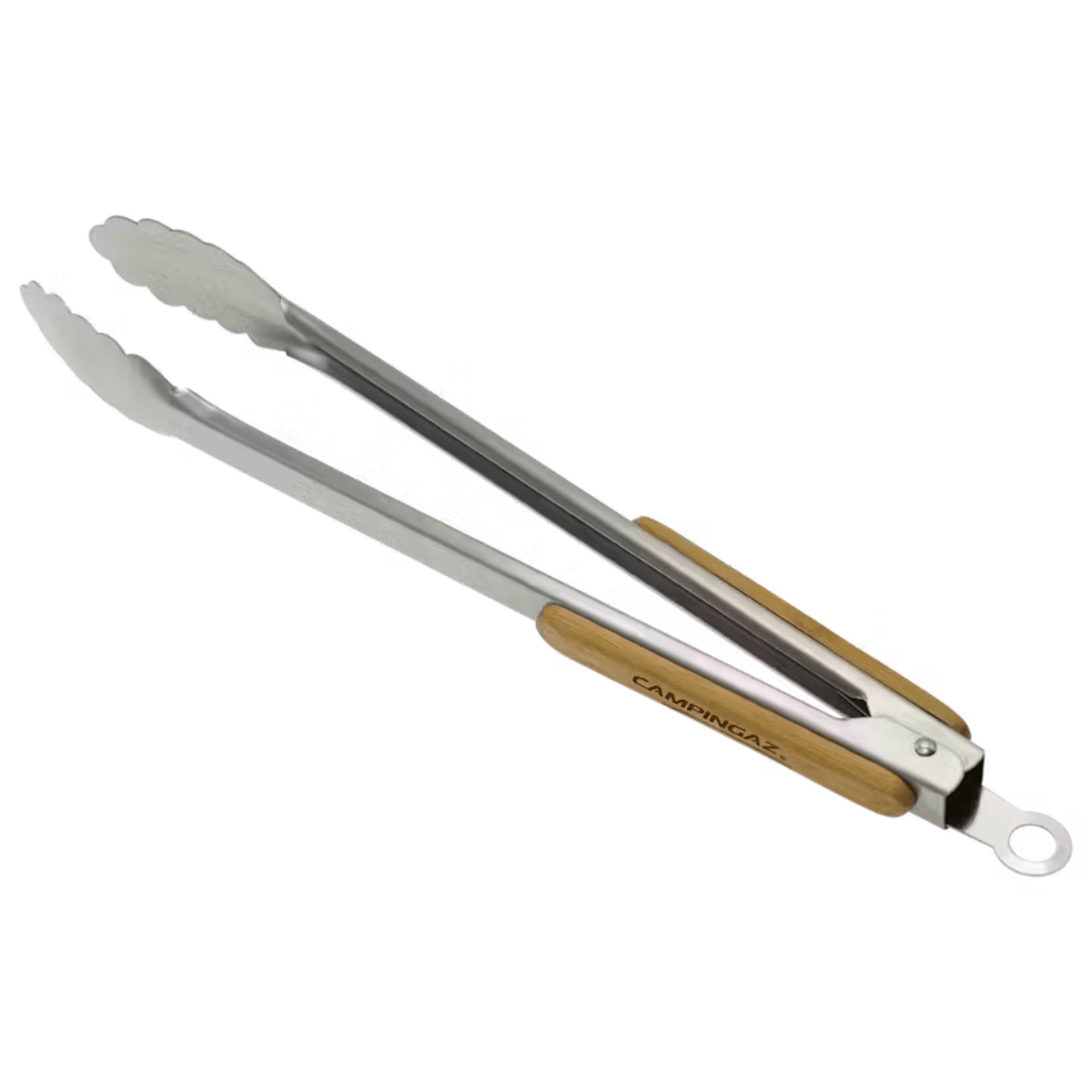Špachtle o rozměrech 36 × 8 cm je ideální pro obracení masa, zeleniny nebo dalších pokrmů. Kleště o délce 39 cm umožňují bezpečnou manipulaci s jídlem i při vyšších teplotách.