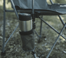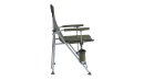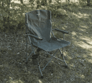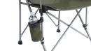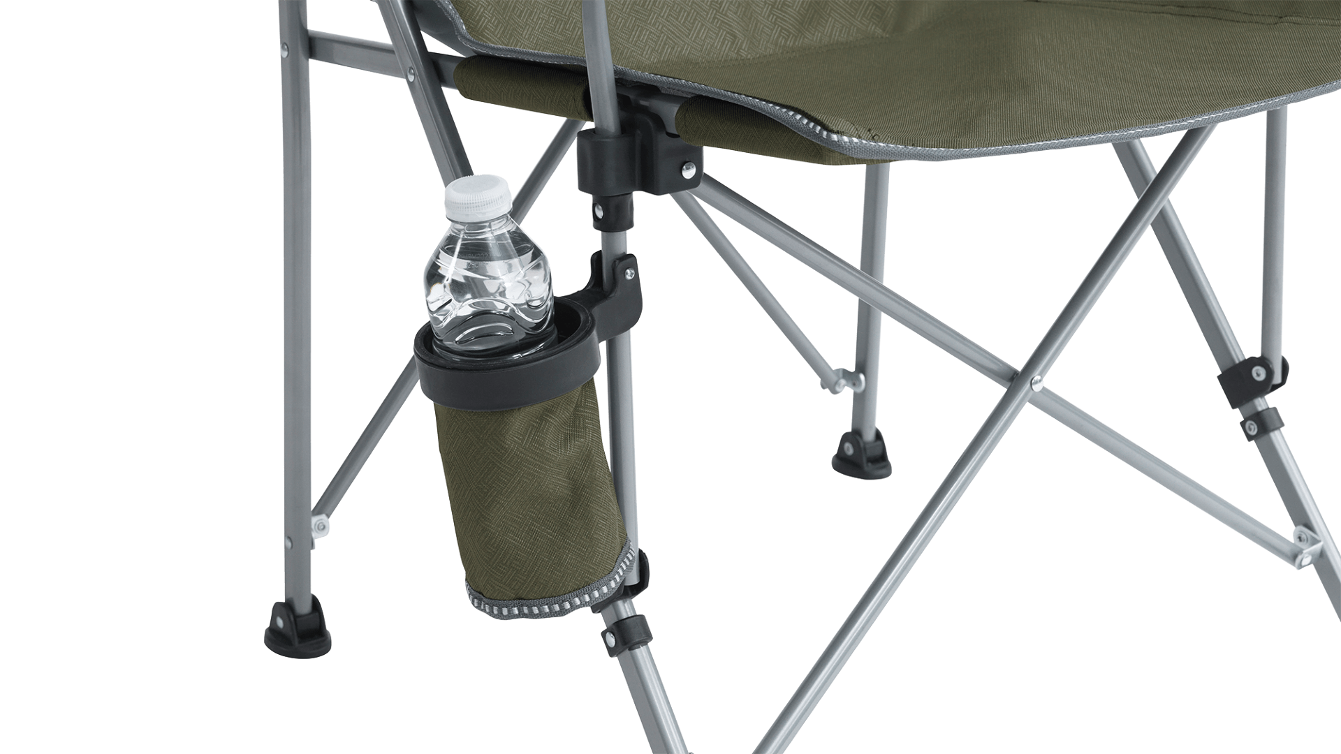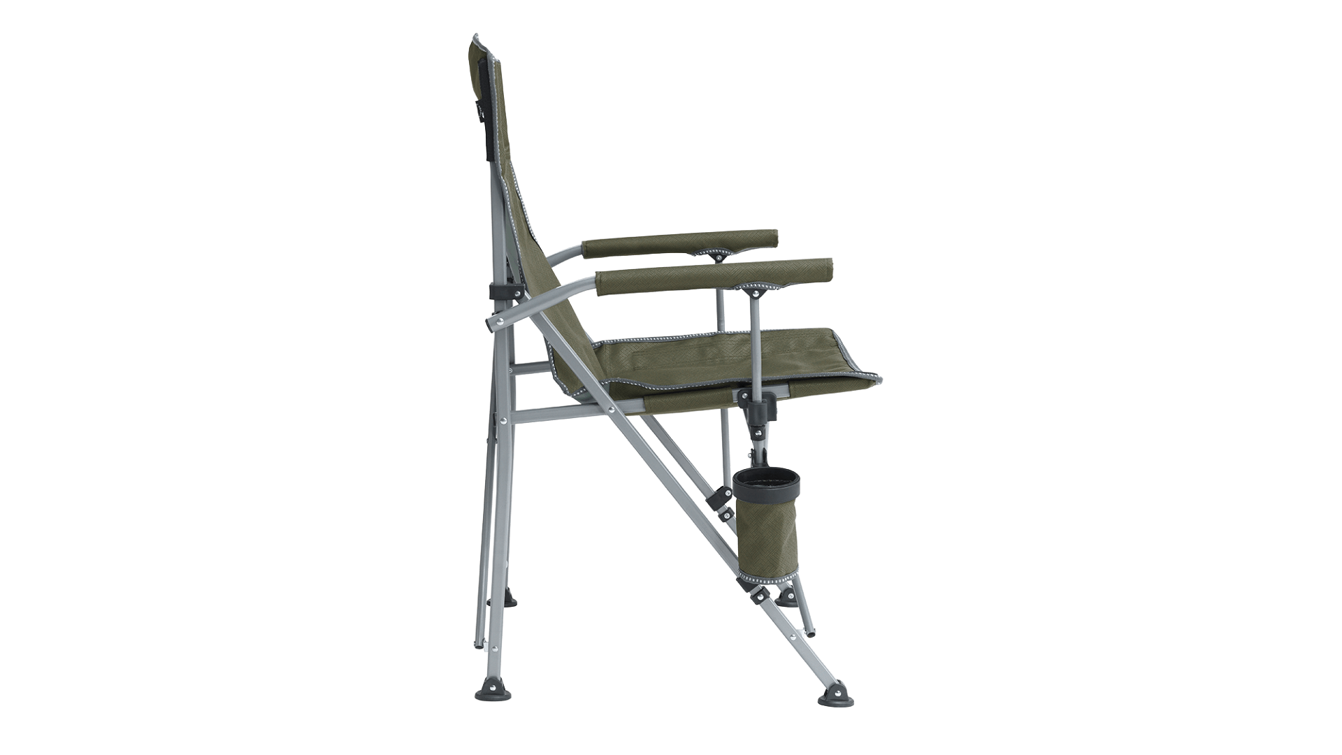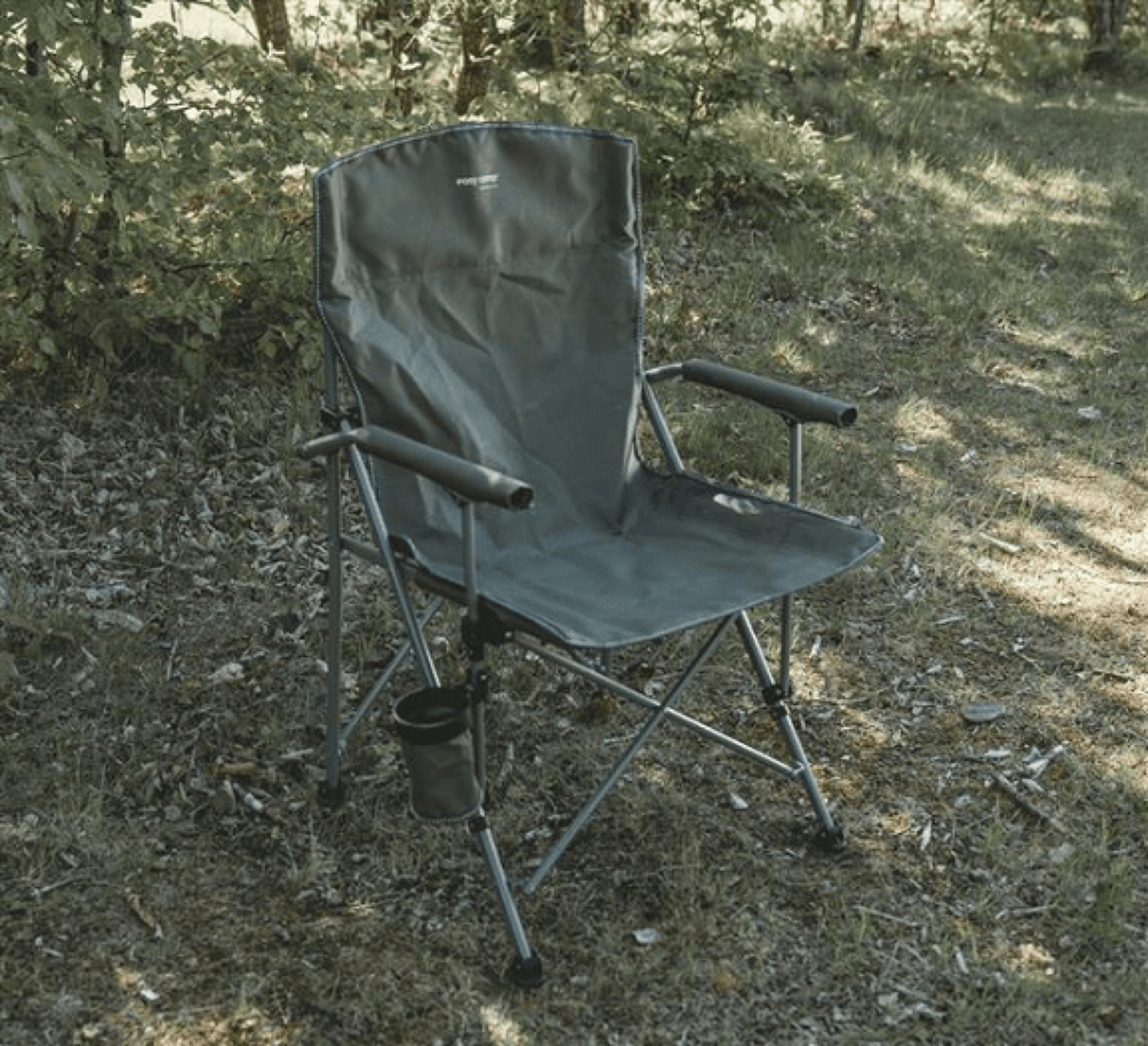 Pohodlné kempingové křeslo s vyšším posedem, držákem na nápoje a polstrovanými područkami.