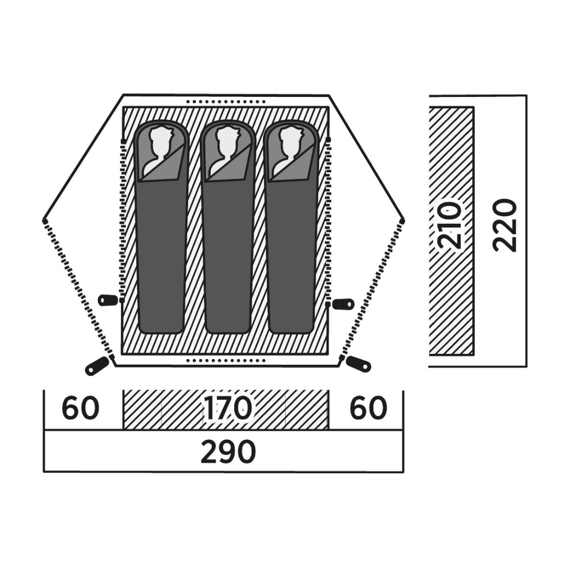 Stan nabízí jednu ložnici a dvě předsíňky, které poskytují dostatek prostoru pro uložení vybavení, obuvi nebo batohů. Dva vstupy umožňují pohodlný přístup do stanu a zvyšují flexibilitu při používání.