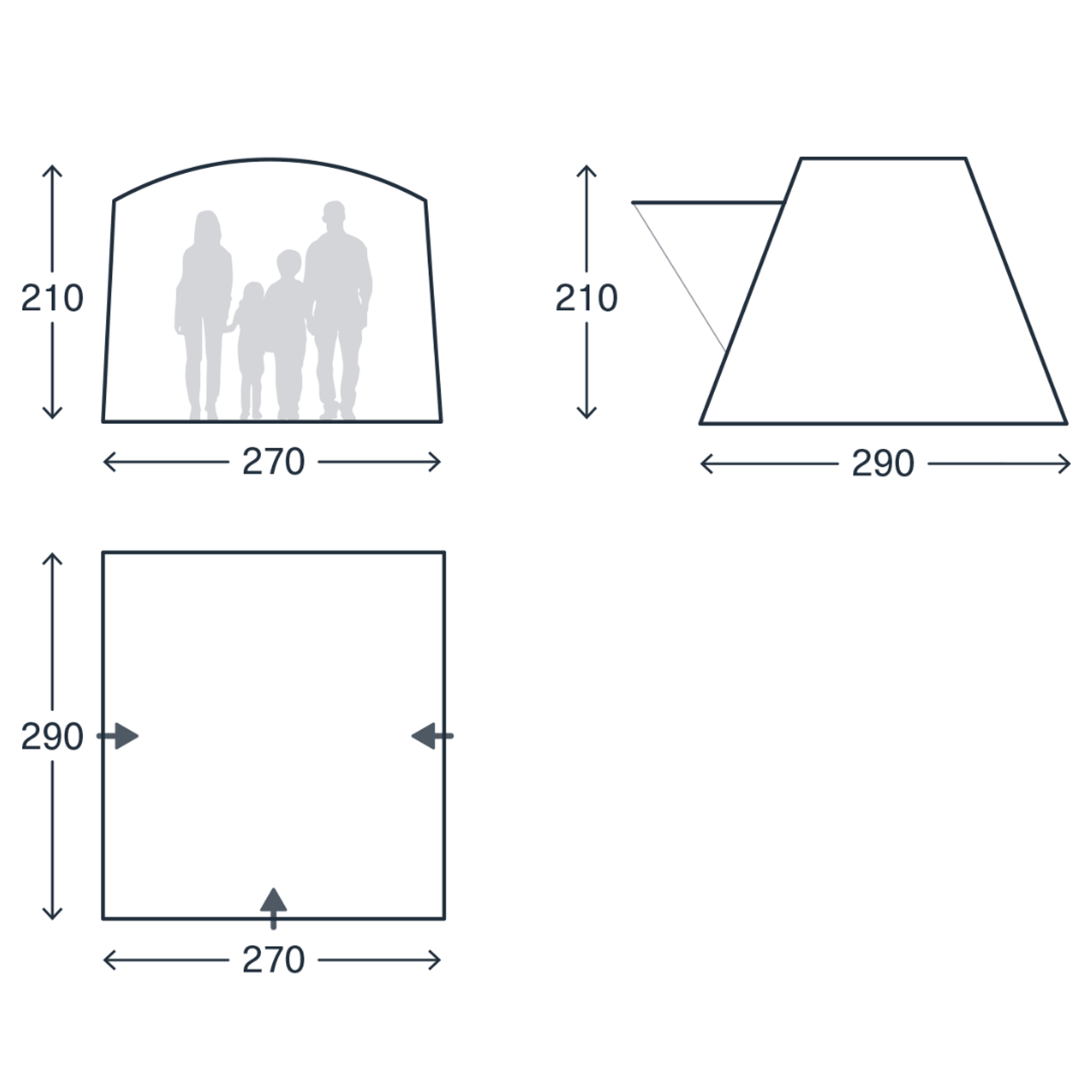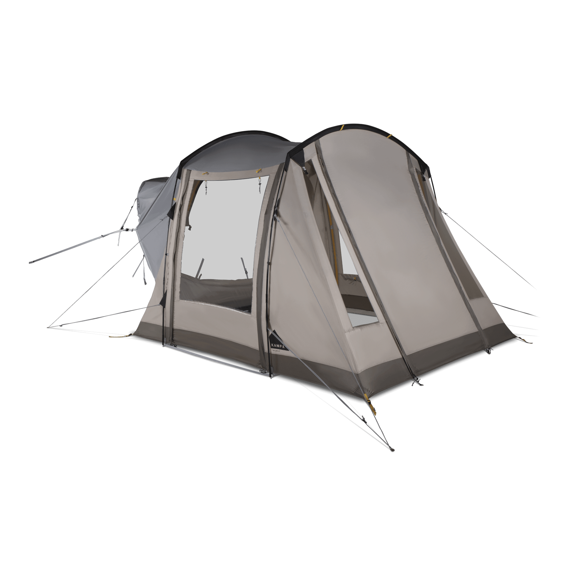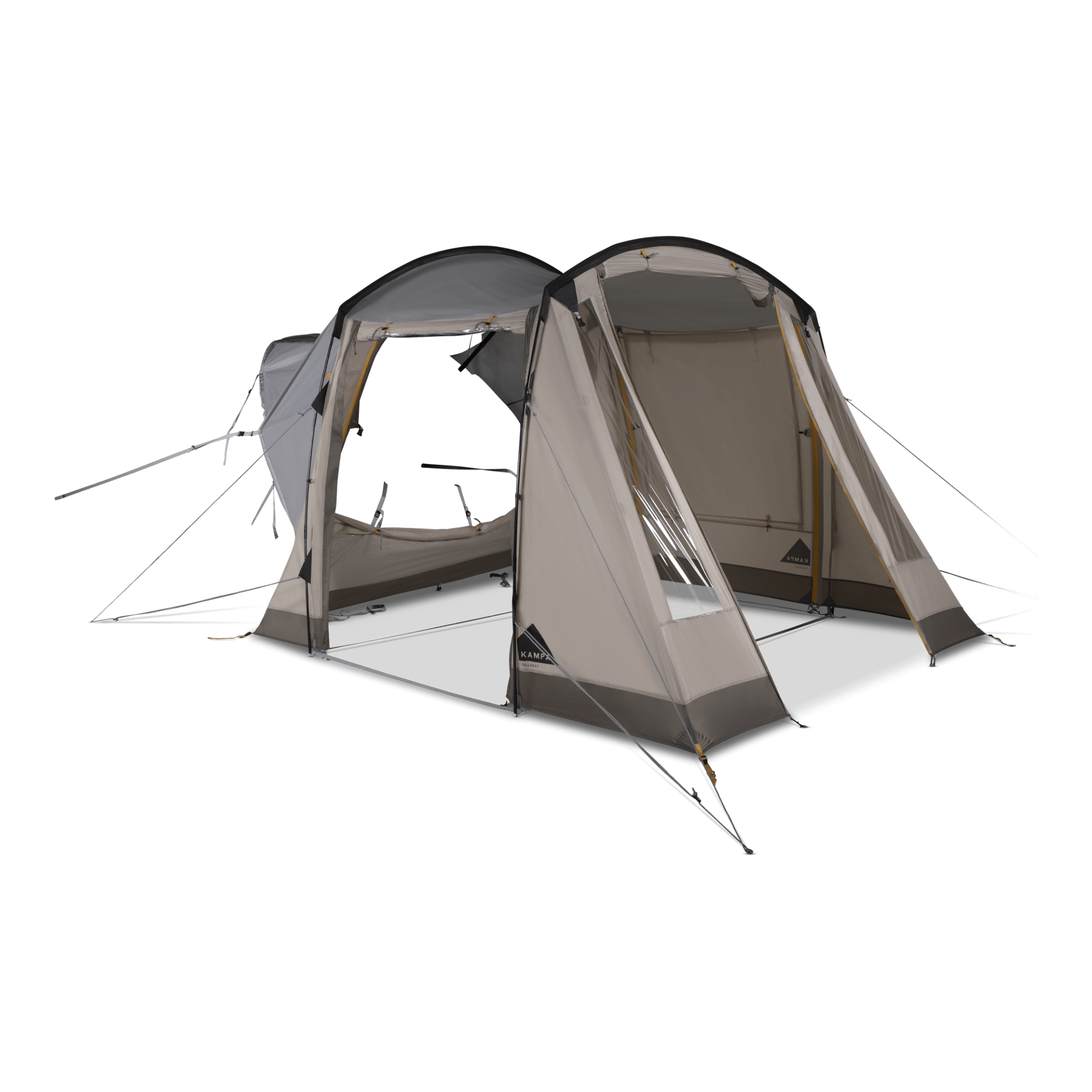 Kampa Tailnest nabízí vstupy na třech stranách, což zajišťuje pohodlný přístup a velmi dobrou ventilaci. Okna lze také vyklopit a použít jako dveře nebo stříšku, případně je možné s použitím volitelných tyčí vytvořit dodatečný přístřešek proti slunci nebo dešti.