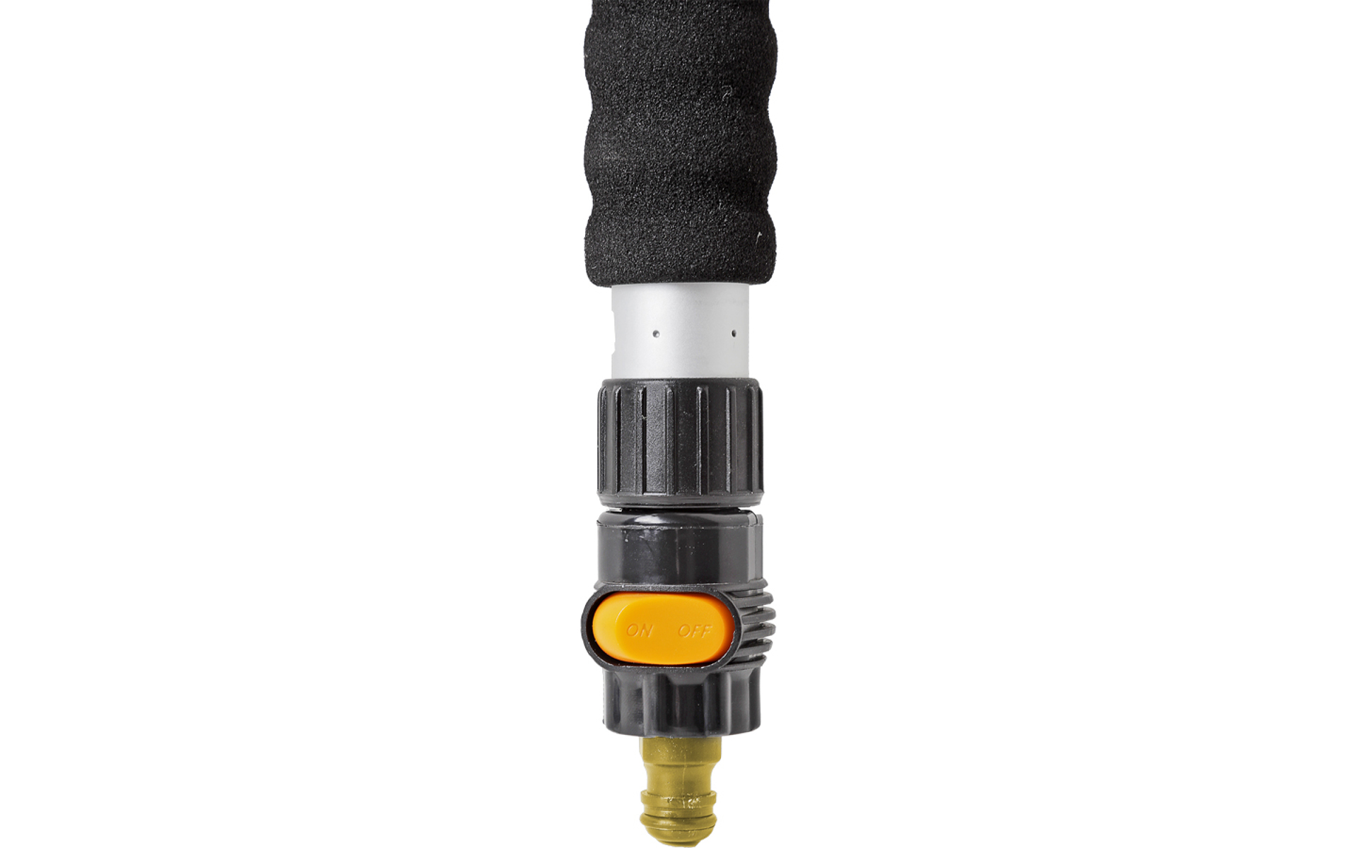 Kartáč je vybaven integrovaným ON/OFF ventilem přímo na rukojeti, což vám umožní snadno regulovat průtok vody, aniž byste museli běhat k ventilu na hadici. To je ideální při čištění různých částí vozidla nebo přepínání mezi mytím a oplachováním.