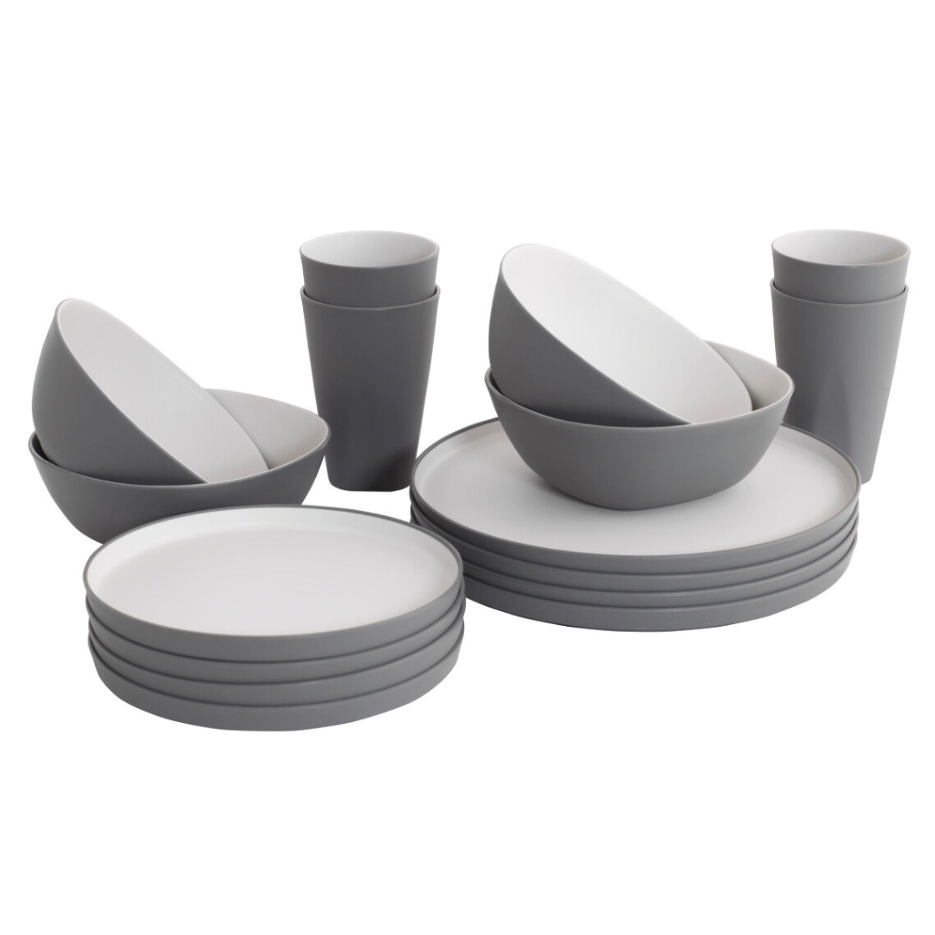 Jídelní sada pro 4 osoby. Obsahuje talíře, misky a kelímky z lehčeného nerozbitného materiálu s elegantním designem a možností stohování pro snadné skladování.