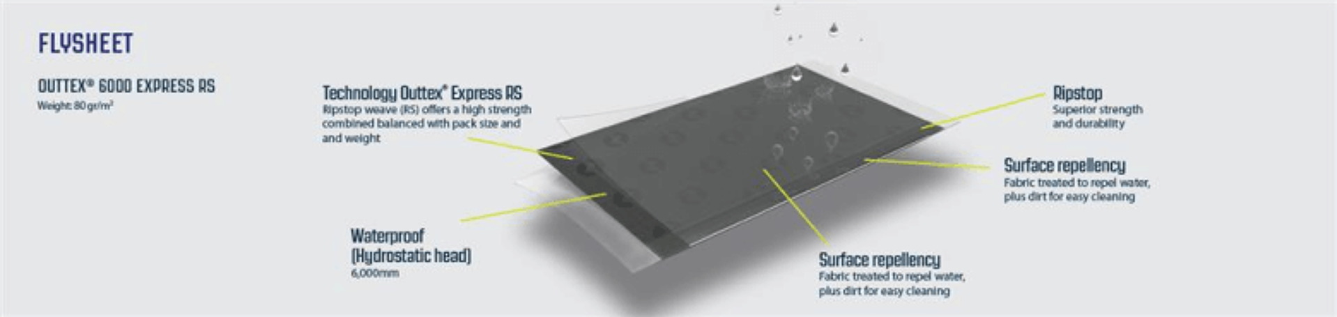 Stan je vyroben z tropika Outtex 6000 Express RS polyester, které nabízí vodní sloupec 6000 mm pro spolehlivou ochranu i při nepříznivém počasí. Materiál poskytuje také UV ochranu UPF 30+ a využívá PFAS free vodoodpudivou úpravu Caring Choice.