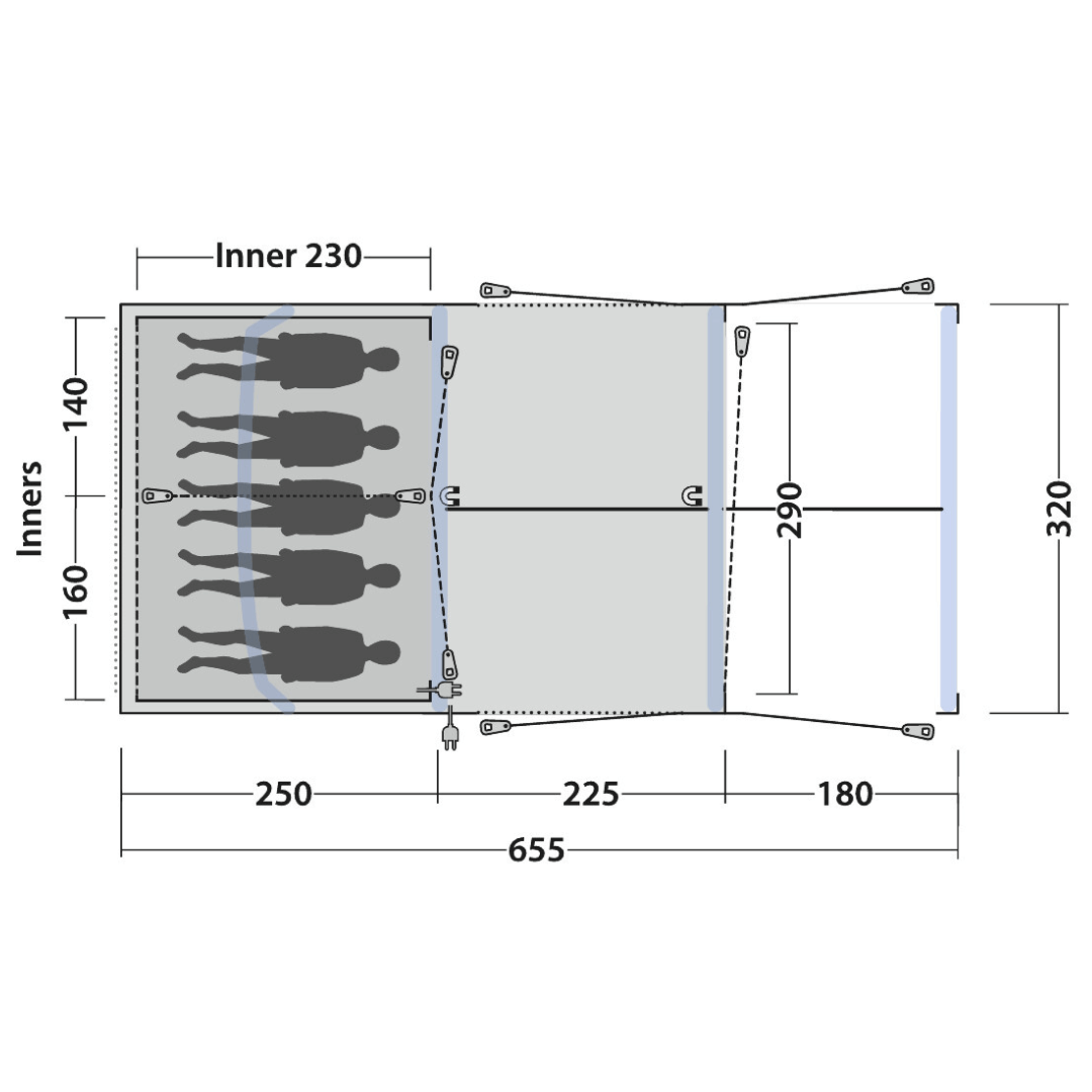 Outwell Iowa 5 Air je prostorný nafukovací rodinný stan pro 5 osob s odolným tropikem Outtex 6000 Express RS, integrovaným Outwell Light System a rychlým postavením.