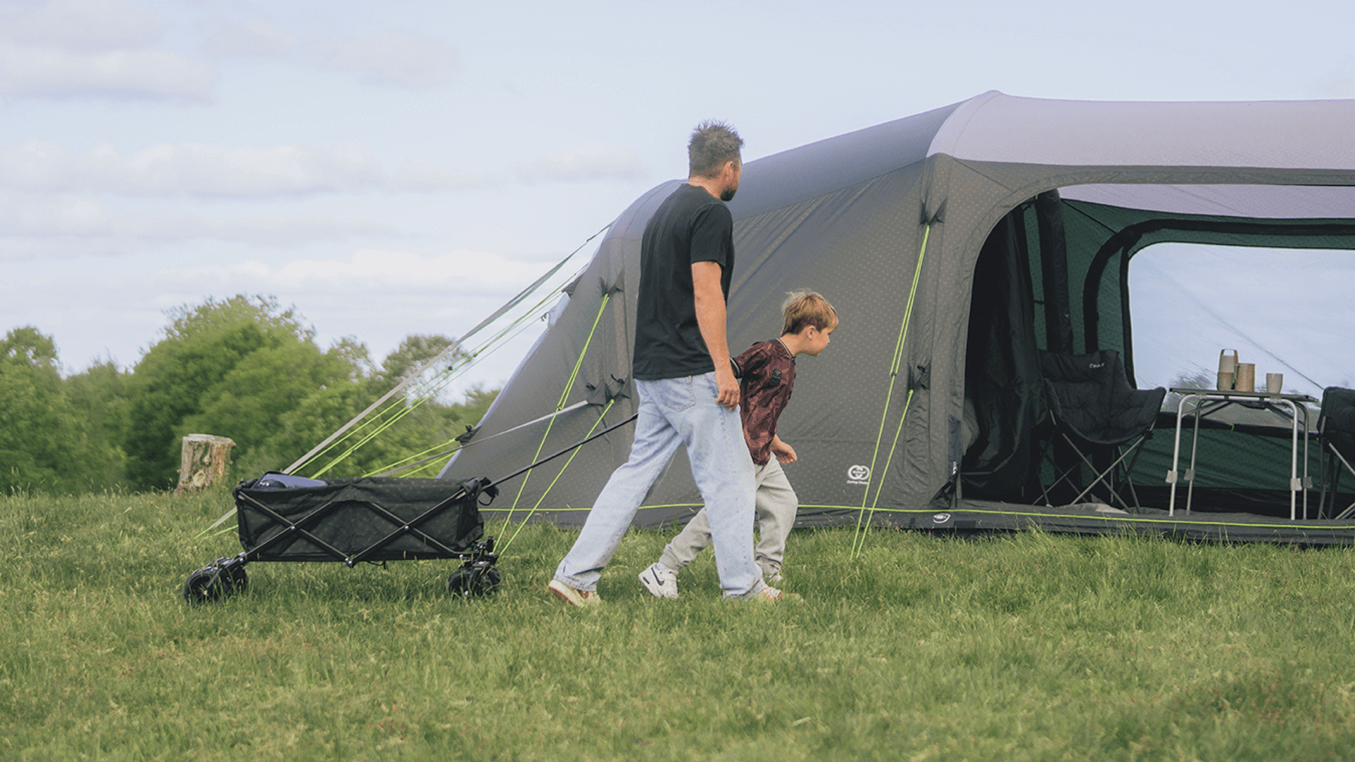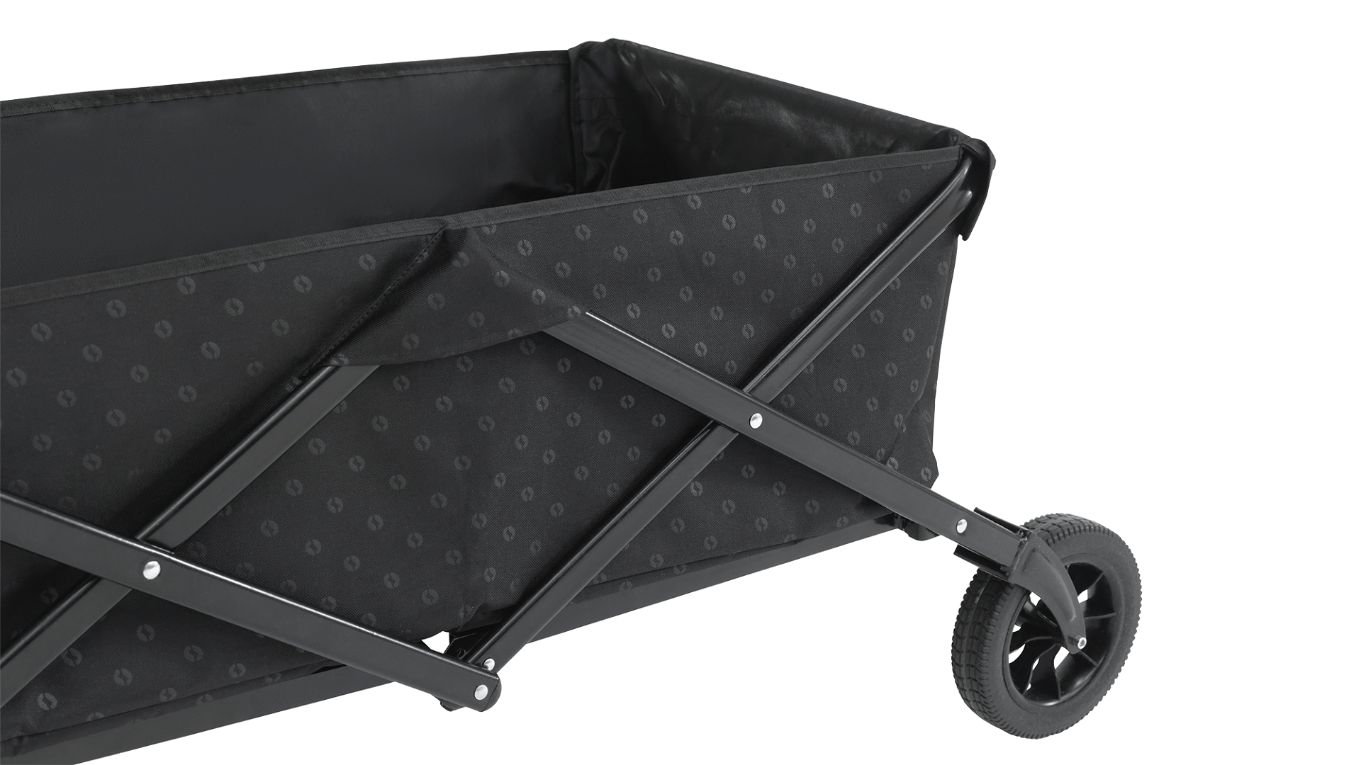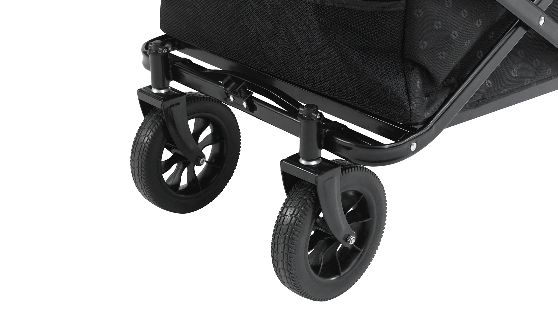 Transportní vozík je vybaven PU koly odolnými proti propíchnutí, která umožňují plynulý pohyb na různých typech povrchu. Díky tomu je vhodný pro přepravu vybavení na trávě, štěrku nebo na plážovém písku.