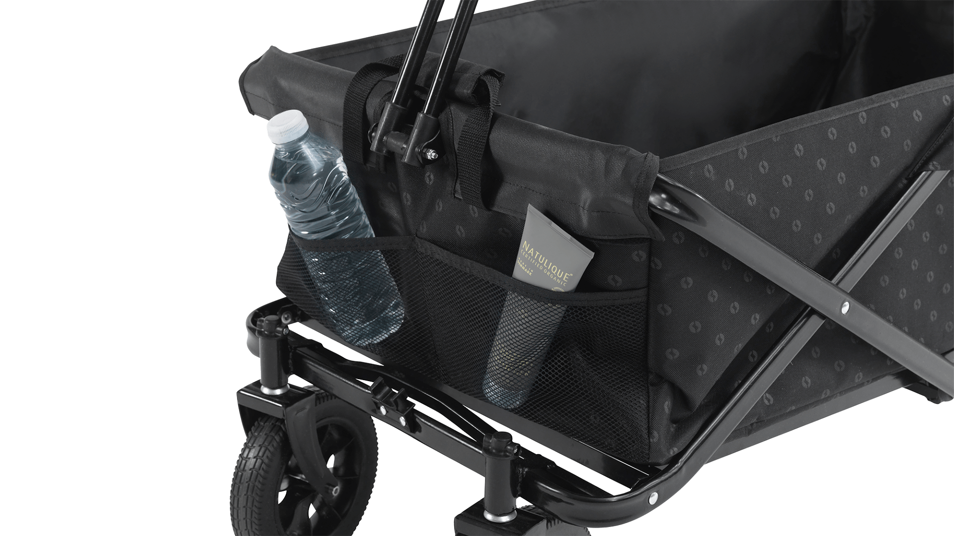Pro lepší organizaci věcí jsou na vnější straně vozíku umístěny dvě síťované kapsy, které umožňují rychlý přístup k drobnostem.