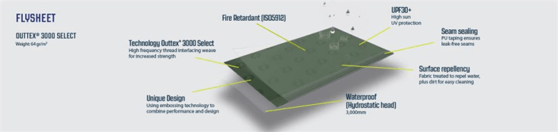 Tropiko je vyrobeno z materiálu Outtex 3000 Select polyester, který poskytuje vodní sloupec 3000 mm pro ochranu před deštěm. Materiál má také UV ochranu UPF 30+ a využívá PFAS free vodoodpudivou úpravu Caring Choice.