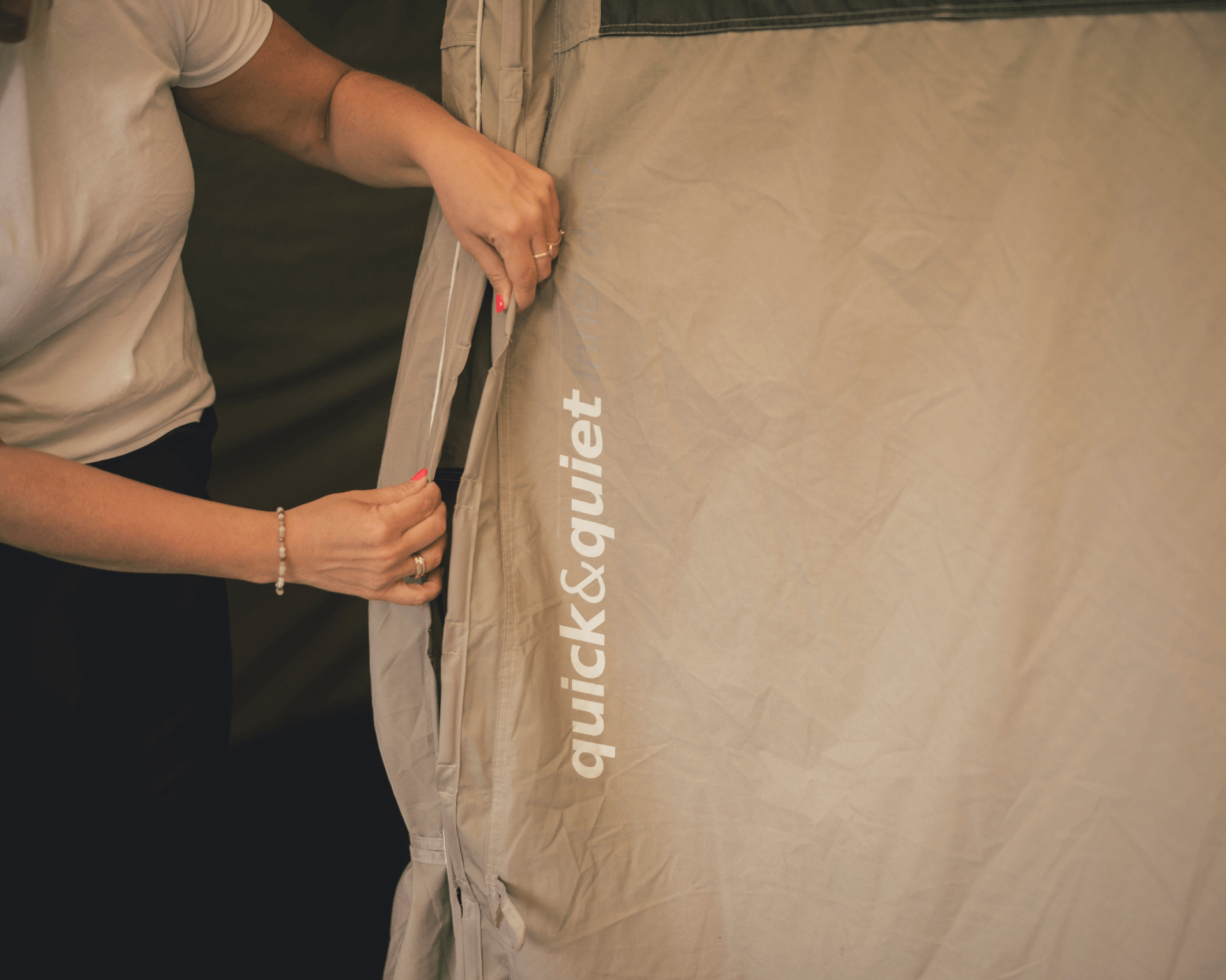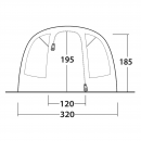 Přední část stanu je řešena jako vertikální přední stěna s markýzou, která poskytuje krytý vstupní prostor. Boční ochranu lze srolovat, což umožňuje flexibilní přístup a lepší větrání.