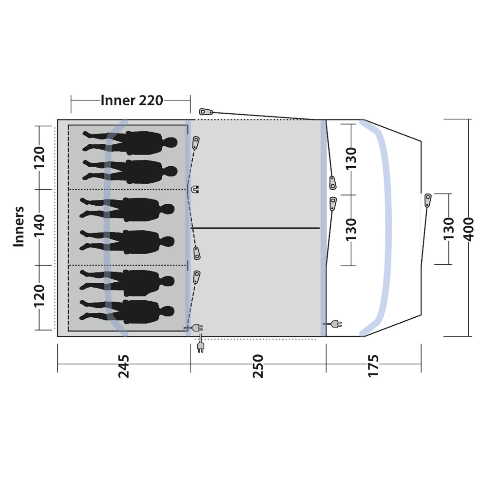 Pro praktické využití prostoru jsou v ložnicích umístěny síťované kapsy na drobnosti. Stan má také další boční vstup s mesh panelem, který umožňuje lepší ventilaci a flexibilní přístup.