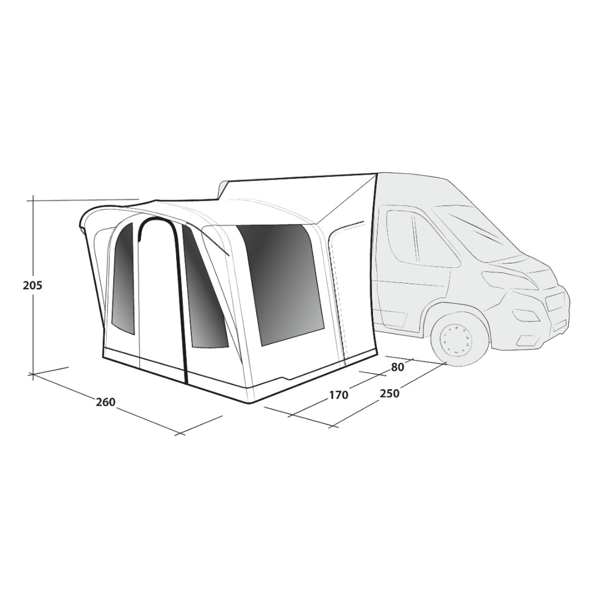 Outwell Santa Monica Air Mid/Tall je kompaktní nafukovací předstan k dodávce, navržený pro vyšší campervany a obytné dodávky. Poskytuje praktický obytný prostor vedle vozidla při kempování a může sloužit také jako místo pro odpočinek nebo volitelný spací prostor na kempovacím místě.