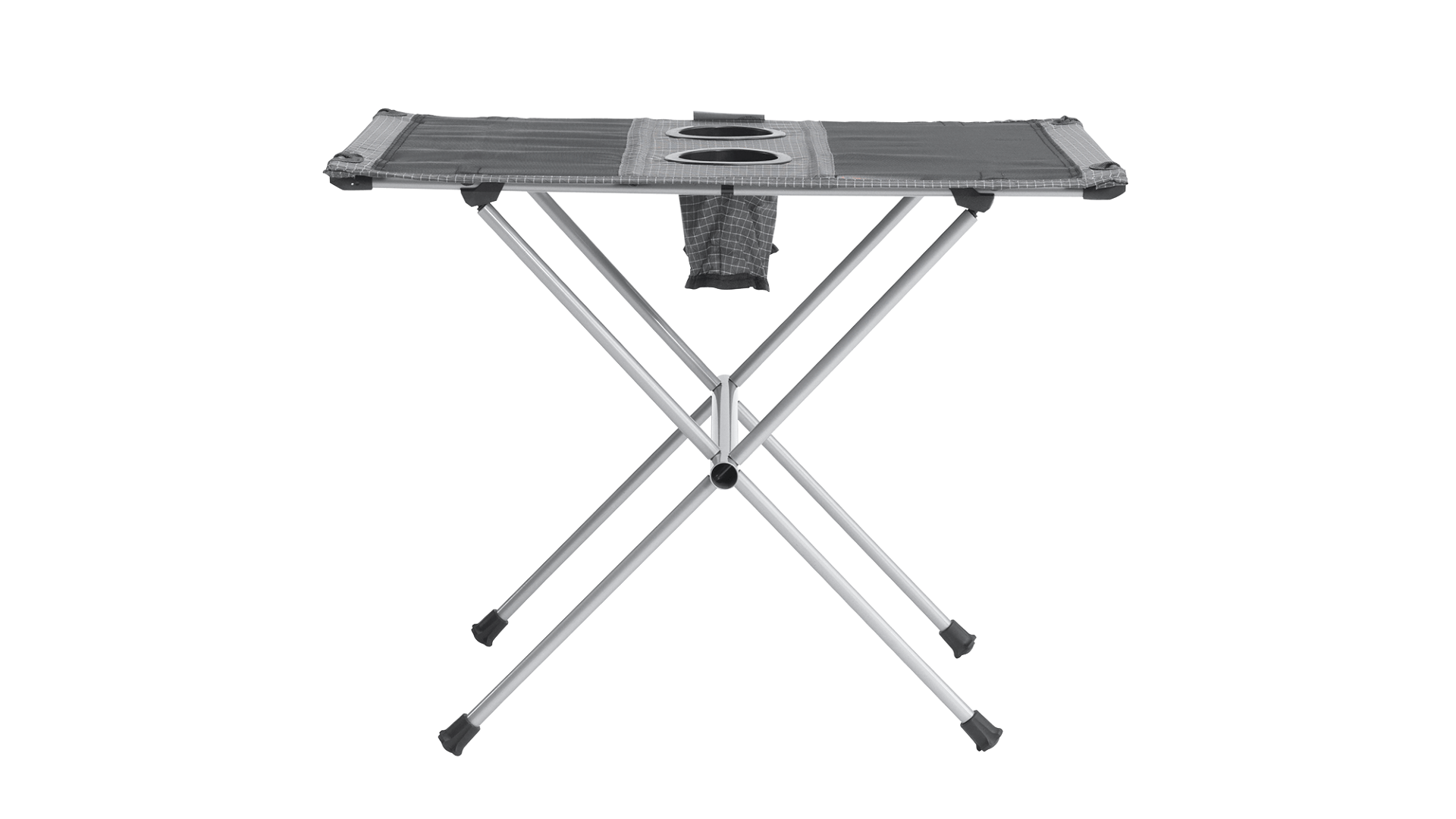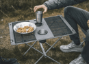 Lehký kempingový stolek s ocelovou konstrukcí, držáky na nápoje a nosností 20 kg.