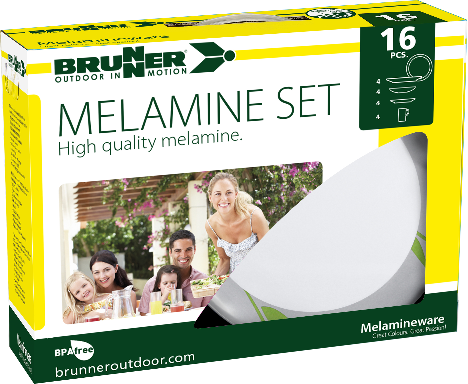 Materiál melamin je vysoce kvalitní plast, který je známý svými vlastnostmi ideálními pro outdoorové použití. Je odolný vůči teplu a vlhkosti, bez chuti a zápachu, zdravotně nezávadný a určený pro kontakt s potravinami. Povrch je velmi tvrdý, což zajišťuje vysokou odolnost proti nárazu a poškození.