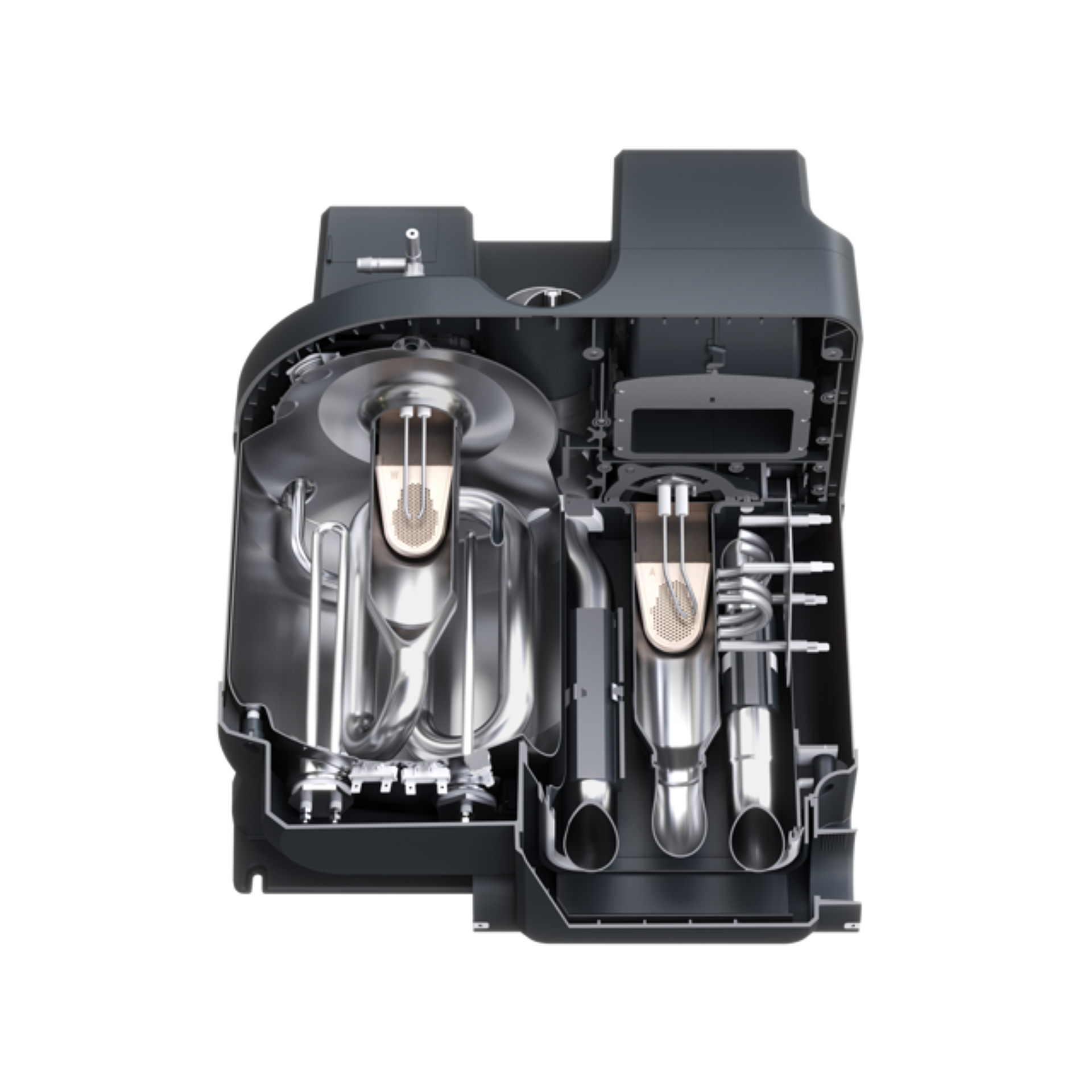 Plynové/elektrické topení Dometic TwinBoost 8000H se dvěmi oddělenými komorami. Jedna pro vzduch, druhá pro teplou vodu.