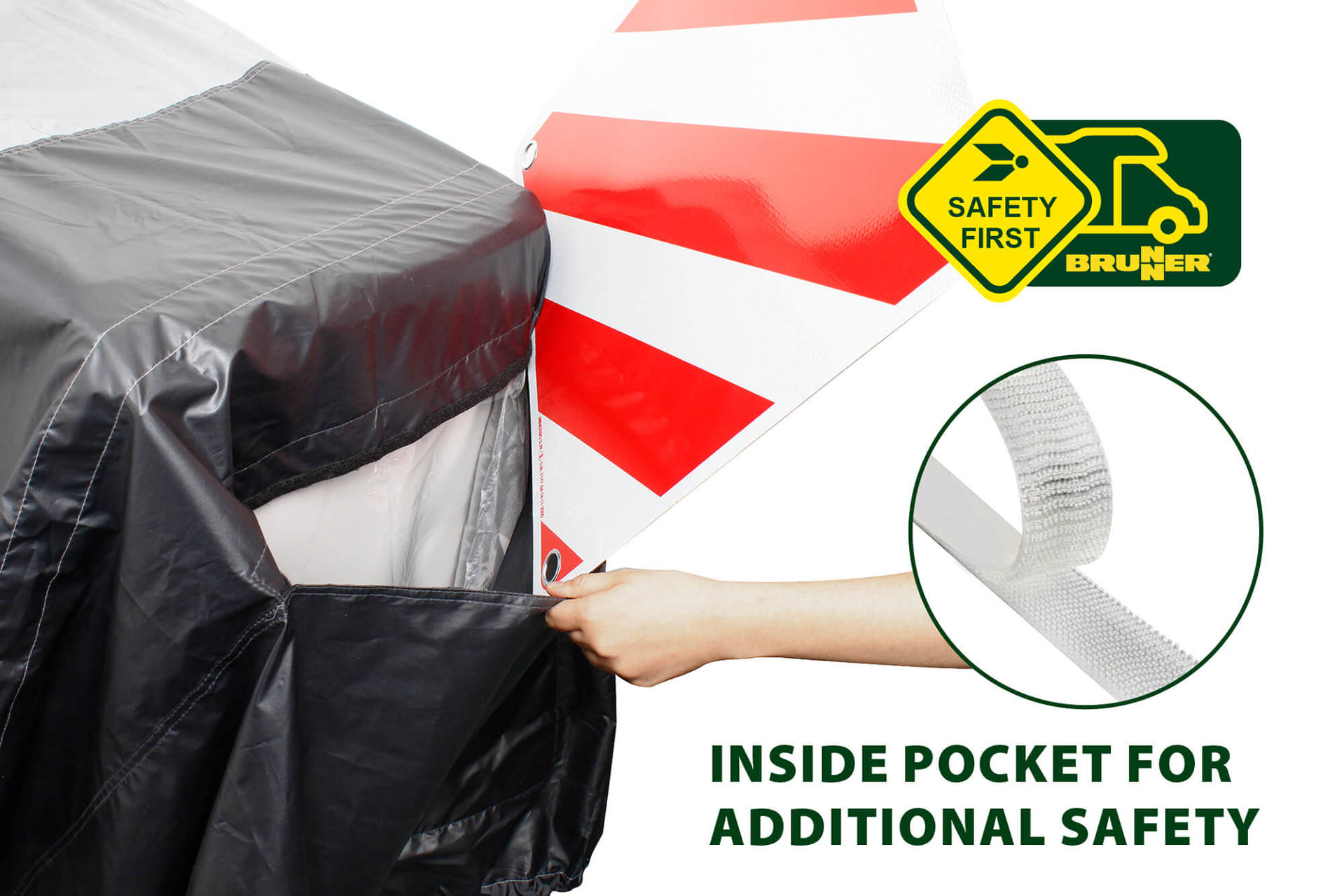 Praktickým prvkem je transparentní kapsa pro výstražnou tabuli, která umožňuje snadné umístění bezpečnostní značky podle dopravních předpisů.