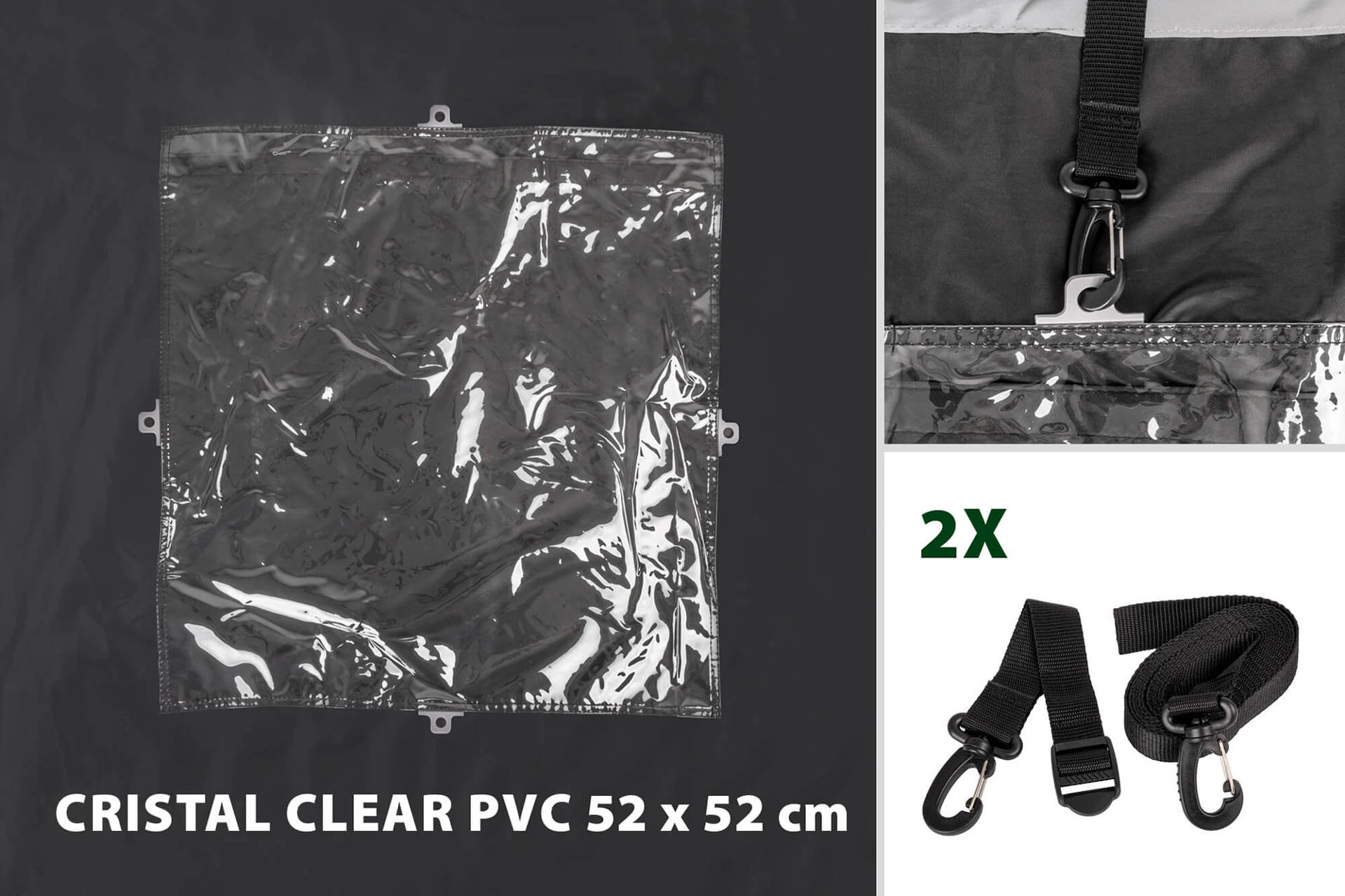 Pro stabilitu během jízdy je obal vybaven několika napínacími popruhy, které pomáhají udržet obal pevně na místě a omezují jeho pohyb nebo vlání ve větru.