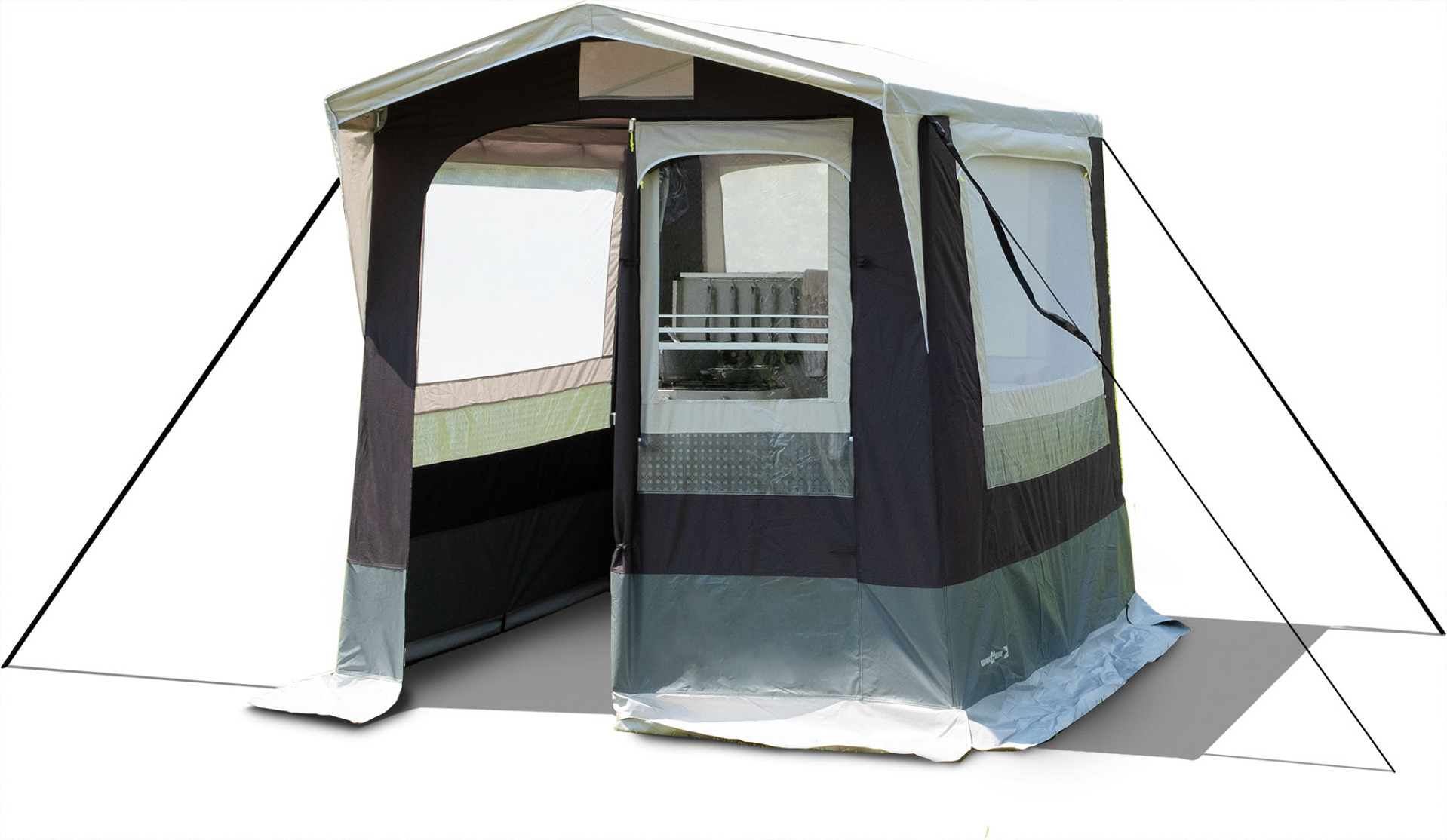 Mezi klíčové prvky patří velká síťovaná okna s kryty, která zajišťují účinné větrání a zároveň chrání před hmyzem. Kolem celého stanu jsou lemování proti blátu, která chrání interiér před vlhkostí a nečistotami. Zvětšené vstupní dveře umožňují pohodlný přístup i s větším vybavením a dodatečná průhledná okénka přivádějí do interiéru více denního světla.