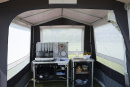 Prostorný kuchyňský stan s větratelnými okny, vysokým stropem a přípravou na LED osvětlení pro pohodlné vaření i za deště.