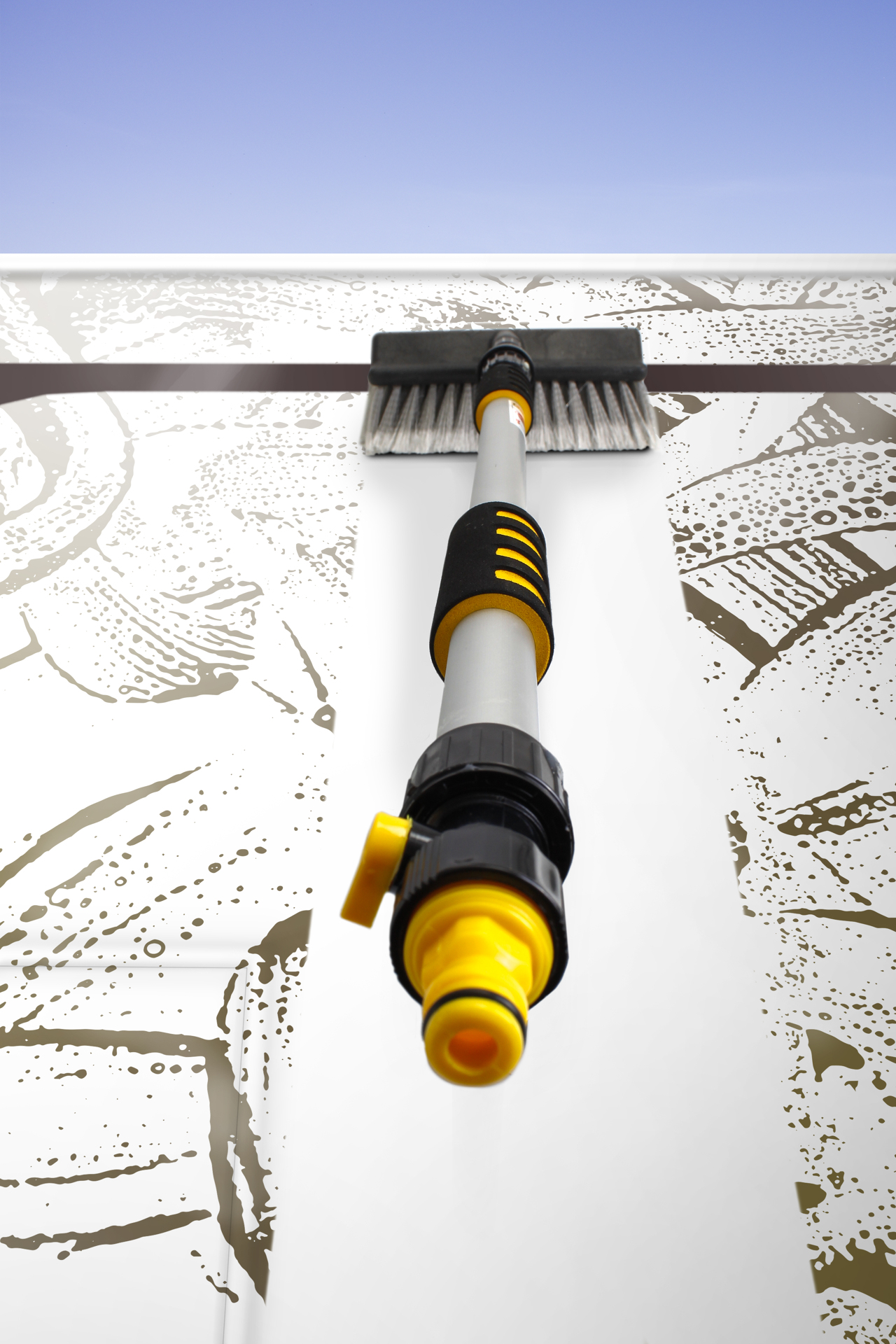 Brunner Moppy je teleskopický kartáč s průtokem vody a rychlospojkou na hadici, ideální pro mytí karavanu i markýzy.