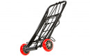 Lehký skládací vozík s ocelovou konstrukcí a popruhy, ideální pro převoz menších nákladů po nerovném terénu kompaktní a snadno přenosný.