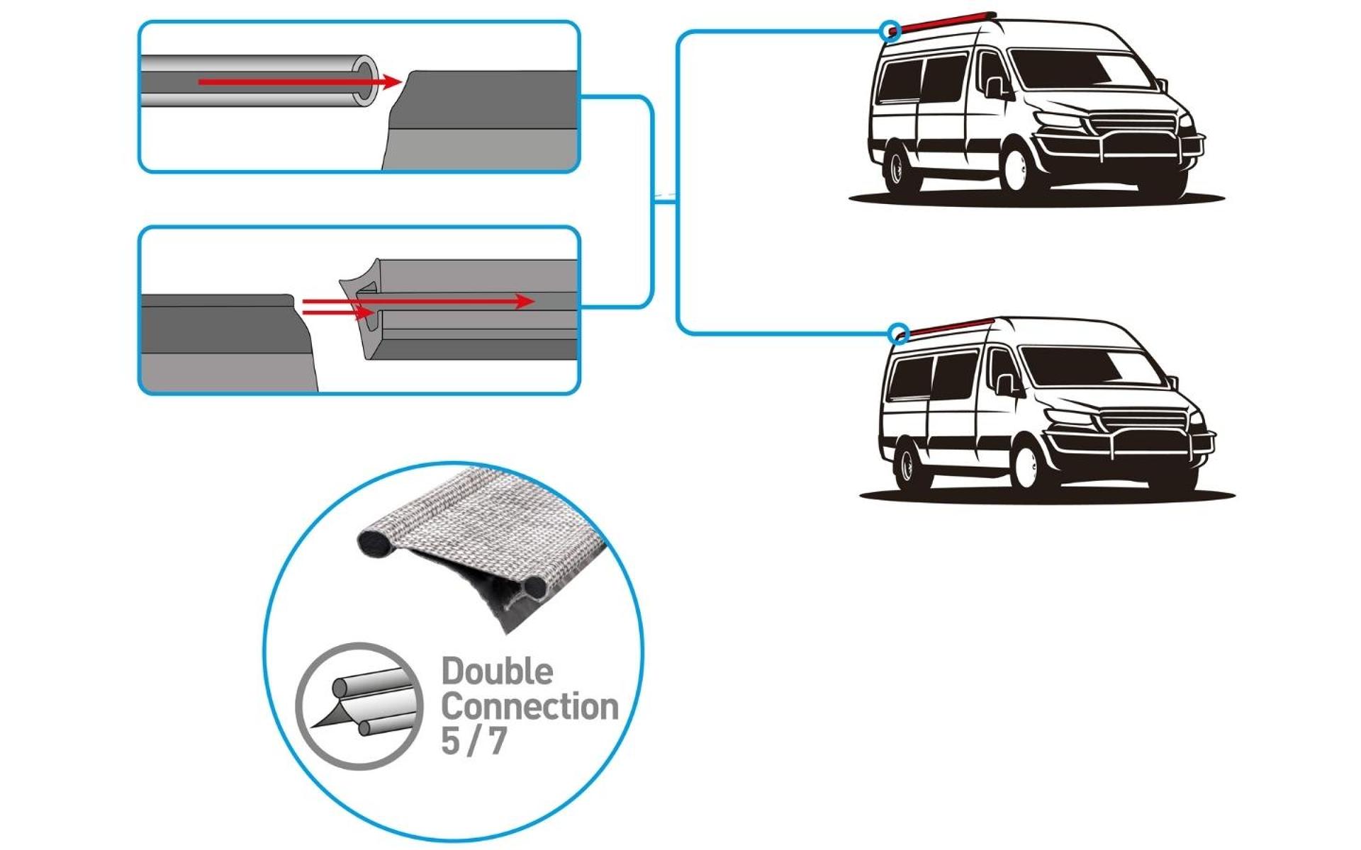 Slunečník se jednoduše připojuje k vozidlu buď pomocí keder lišty, nebo přiložené přítlačné tyče s úchyty. Využití najde především u dodávek typu campervan či menších karavanů, kde rozšiřuje zastřešený prostor a poskytuje příjemný stín na cestách i v kempu.