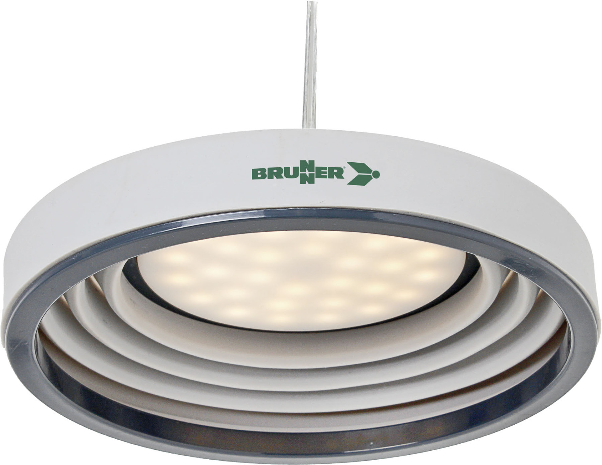 Závěsné LED světlo Brunner Syrma s výkonností 520 lumenů, skládacím silikonovým stínítkem, stmívačem a 5m kabelem. Ideální do stanu i pod předstan.